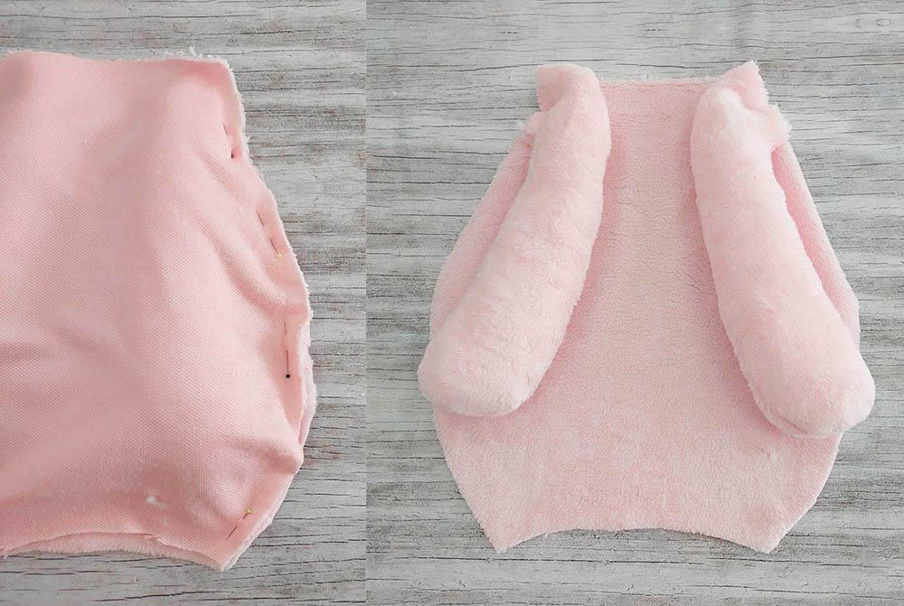 8. Na brzuchu zająca ułóż rączki, przypnij szpilkami. Następnie przykryj go drugą połową brzucha, aby ułożony był prawą stroną do prawej i zszyj po bokach.