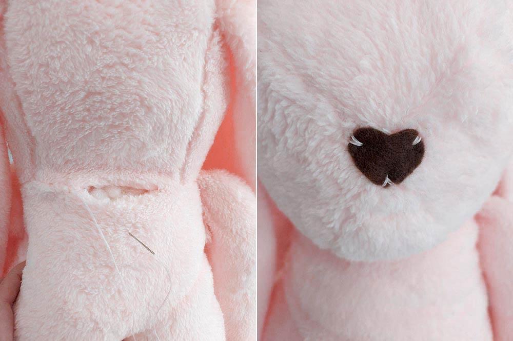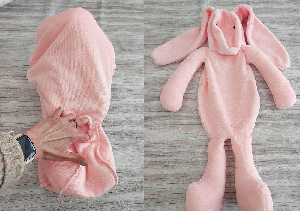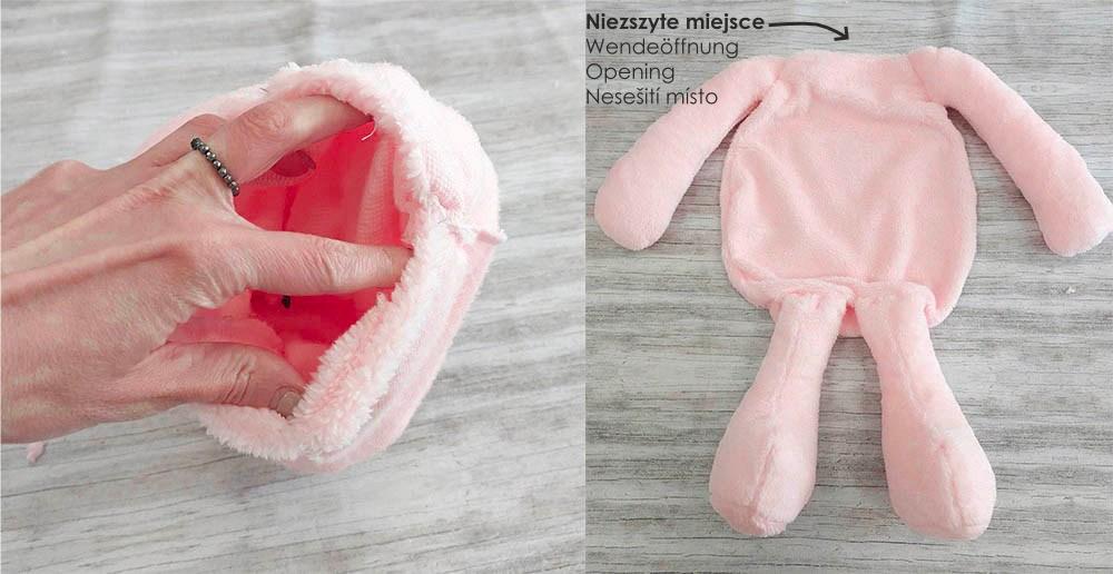 9. U dołu brzucha przypnij równo nogi zająca. Wywróć całość na lewą stronę. Na powstały owalny otwór przyszyj dół brzucha zająca, mocując w ten sposób nogi i zamykając dolną część maskotki.