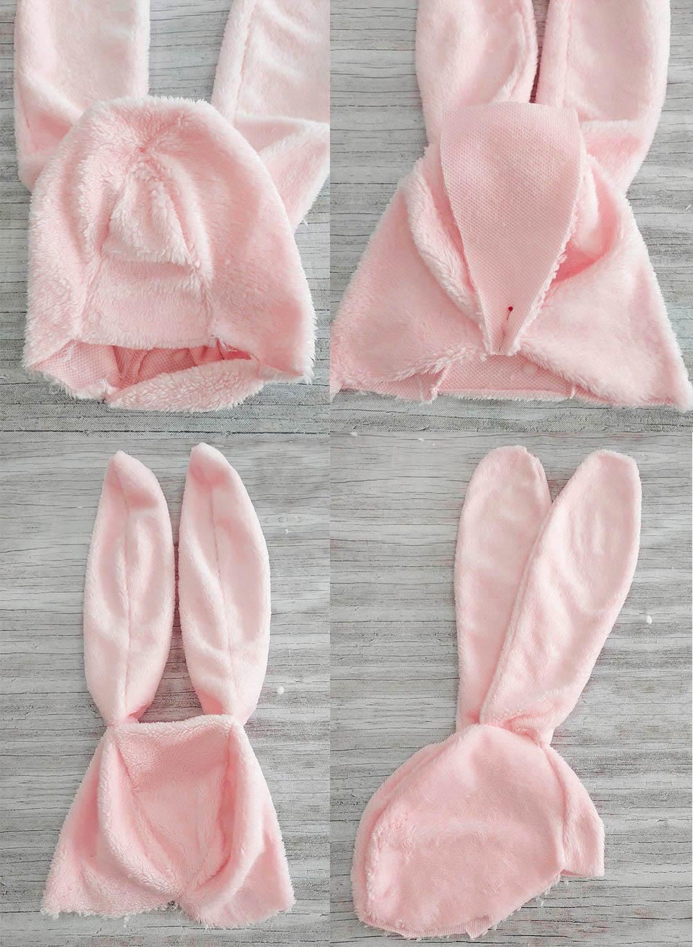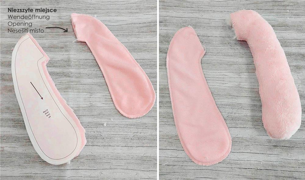 5. Uszy złóż prawą stroną do prawej, zszyj, wywróć, ale nie wypychaj.