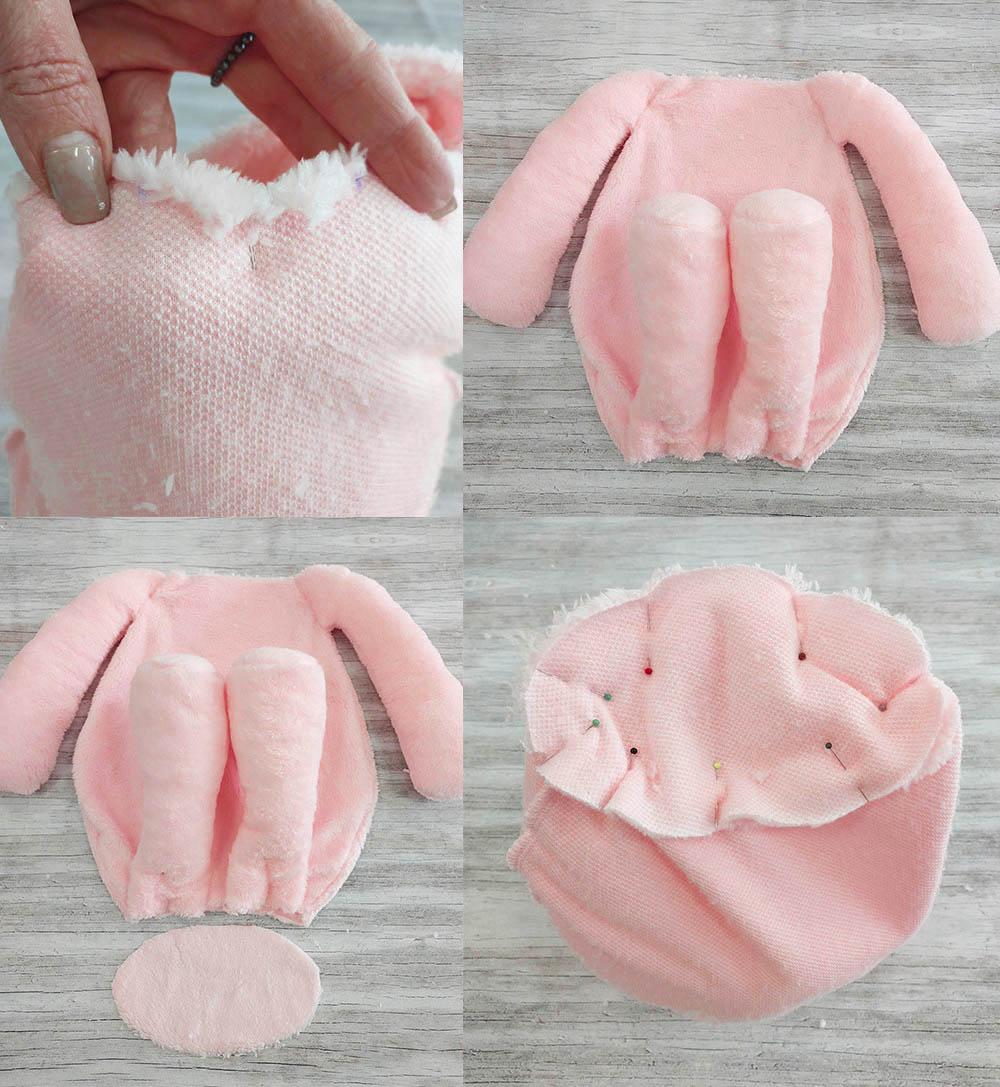 3. Nogi zająca złóż na pół i zszyj, następnie wszyj owalne stopy. Przez pozostawiony otwór wywróć nogę na prawą stronę. Nogi wypchaj kulką silikonową.