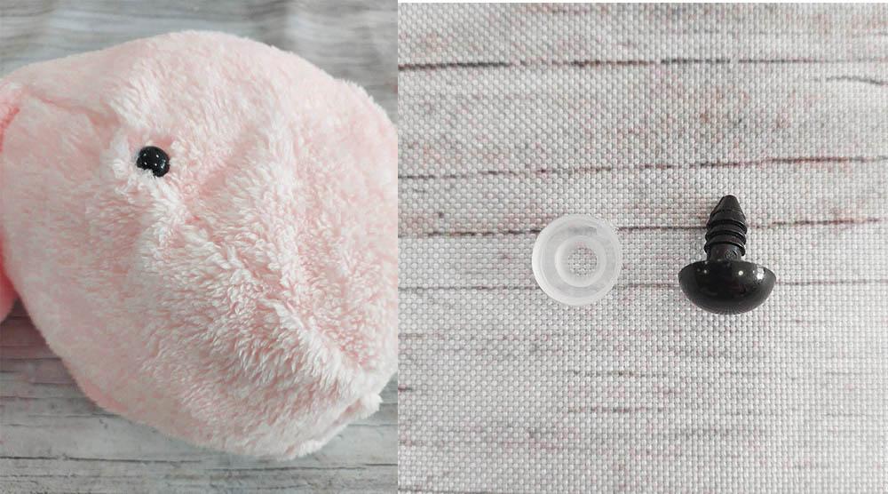 7. Zamontuj oczy zajączkowi w wyznaczonych miejscach. Dla bezpieczeństwa oczy można podkleić.