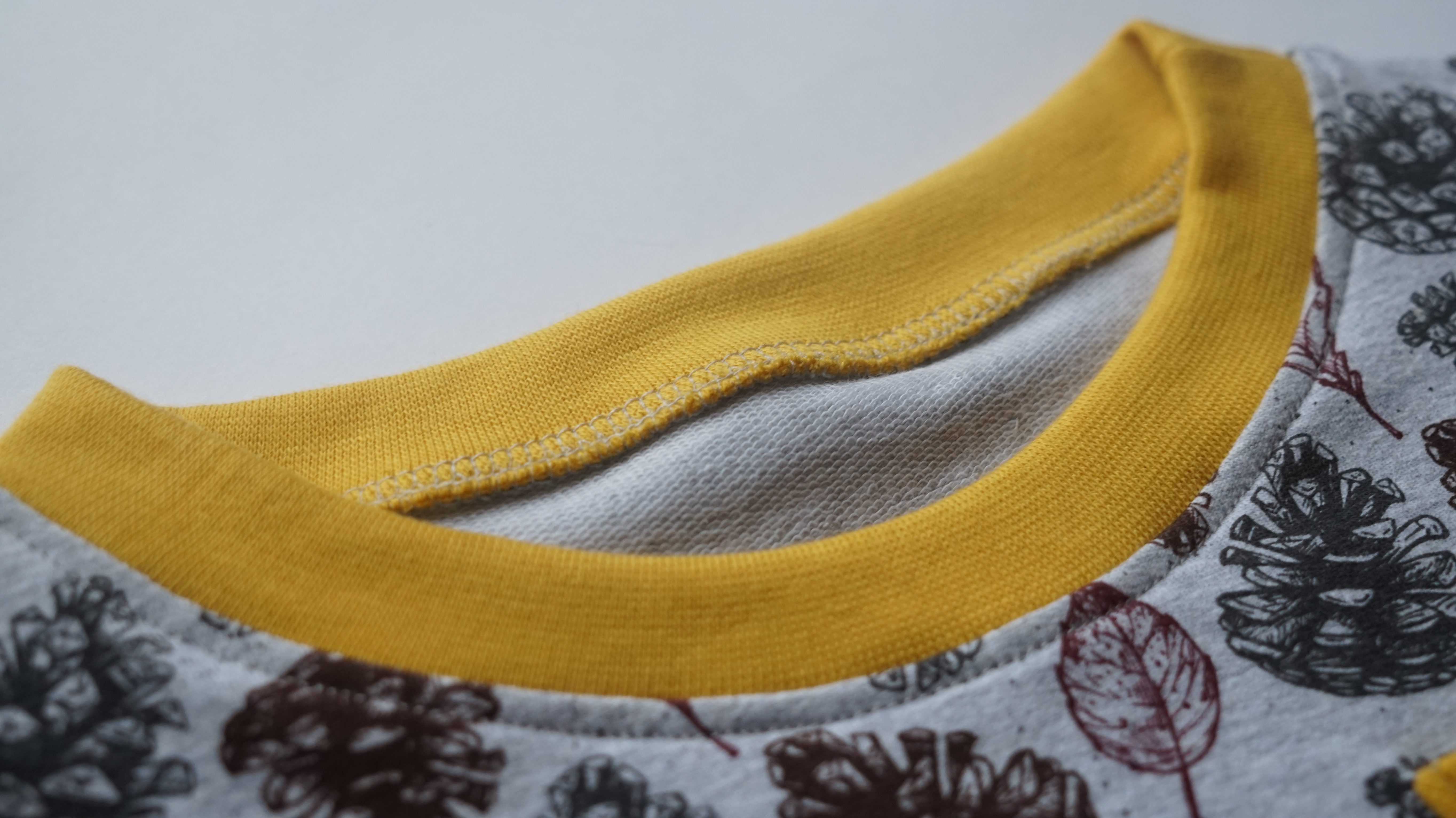 My dodaliśmy jeszcze mały element dekoracyjny z przodu bluzeczki - naszywaną kieszonkę z drewnianym guziczkiem w żółtym kolorze świetnie uzupełniającym się z wzorem SZYSZKI na szarym melanżu dostępnym w sklepie <KLIK>. Kieszonkę przyszywamy przed zszyciem elementów bluzki: