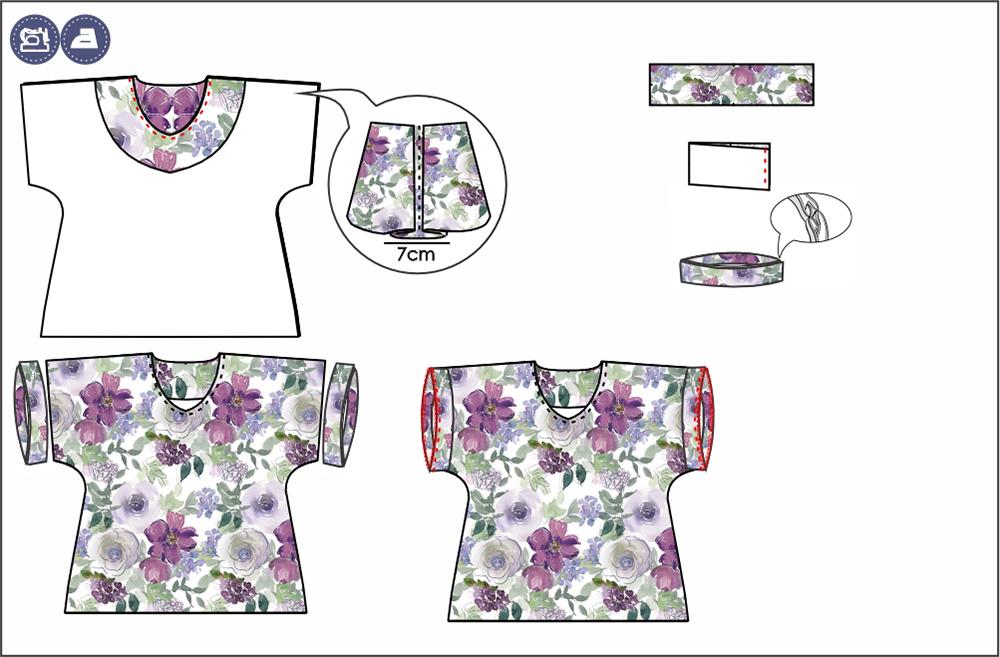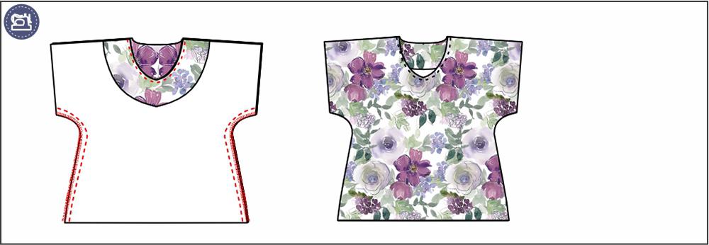 2. Ułóż przód i tył bluzki prawymi stronami do siebie, zszyj szwy ramienne i obrzuć overlockiem.