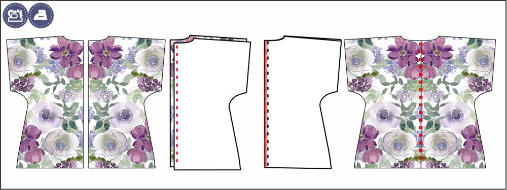 1. TYŁ BLUZKI. Dwa elementy tyłu kimona ułóż prawymi stronami do siebie, zepnij i zszyj po środku. Powstały szew obrzuć i rozprasuj. Szew można przestębnować na 1mm.