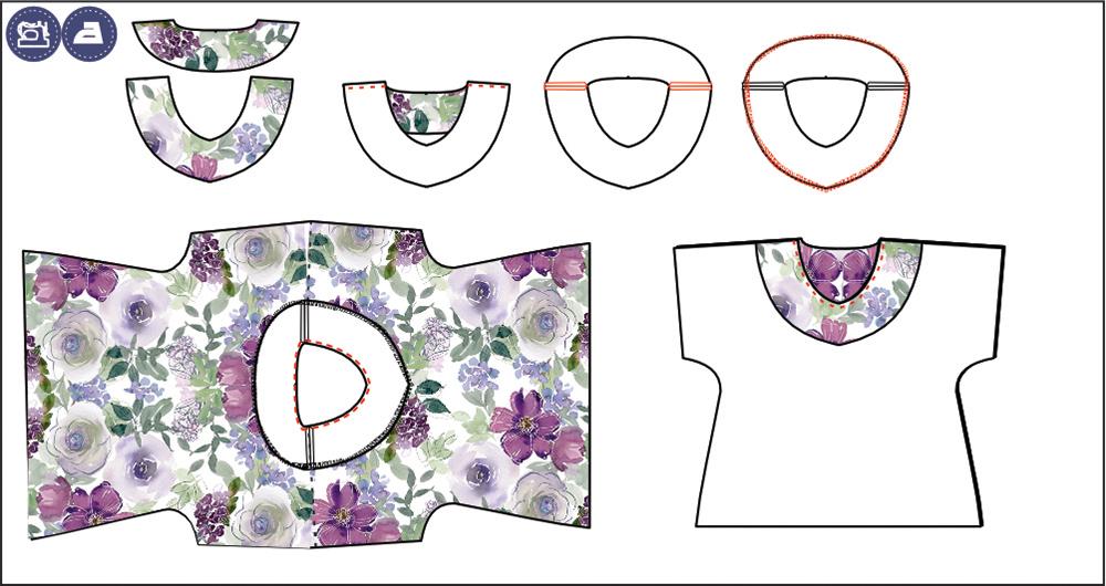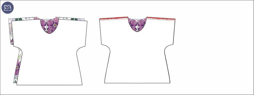 3. Obłożenia bluzki ułóż prawymi stronami do siebie i zszyj. Zszyte obłożenia powinny wyglądać identycznie jak góra bluzki i pasować do niej. Rozprasuj szwy zszytego obłożenia i teraz obrzuć jego zewnętrzną część na overlocku. Upnij obłożenie do bluzki nieobrzuconą stroną, prawą do prawej, szwy ramienne powinny nachodzić na siebie. Zszyj. Obłożenie zaprasuj do wewnątrz, wymodeluj dekolt. Możesz teraz przestębnować dekolt na równą odległość, opcji jest wiele może to być 1mm lub 2cm, można również pozostawić go tylko zaprasowanym z przymocowaniem go wewnątrz na szwach ramiennych ściegiem ręcznym.