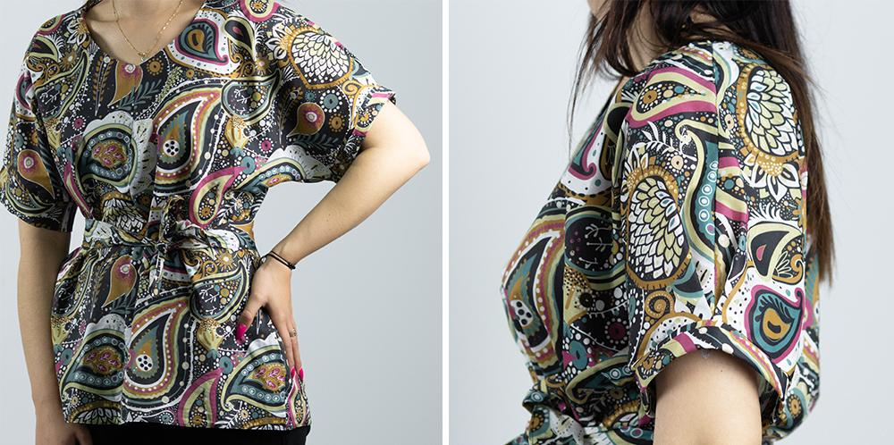 Bluzka typu kimono zainspirowana jest tradycyjnym japońskim stylem. Doda ona Twoim stylizacjom orientalnego akcentu. Projekt na bluzkę typu KIMONO przygotowaliśmy z myślą o wygodzie i swobodzie. Ma ona luźny, przewiewny krój, który doskonale sprawdzi się w ciepłe dni. Bluzka typu kimono przypadła do gustu wielu kobietom, które cenią sobie modę w wygodnym wydaniu. Nasze kimono to model zapewniający komfort noszenia, bez krępowania ruchów i niepotrzebnych marszczeń. Rękawy zakończone są kontrafałdą i mankietem, co sprawia, że kimono wygląda niecodziennie i elegancko. Model ma dekolt V, optycznie wyszczuplający i wydłużający szyję. Dodatkowy pasek do zawiązywania pozwala na indywidualne dopasowanie bluzki do Twojej sylwetki. Możesz nosić ją luźno opadającą, lub zawiązać pasek, aby podkreślić talię i dodać stylizacji nieco elegancji.