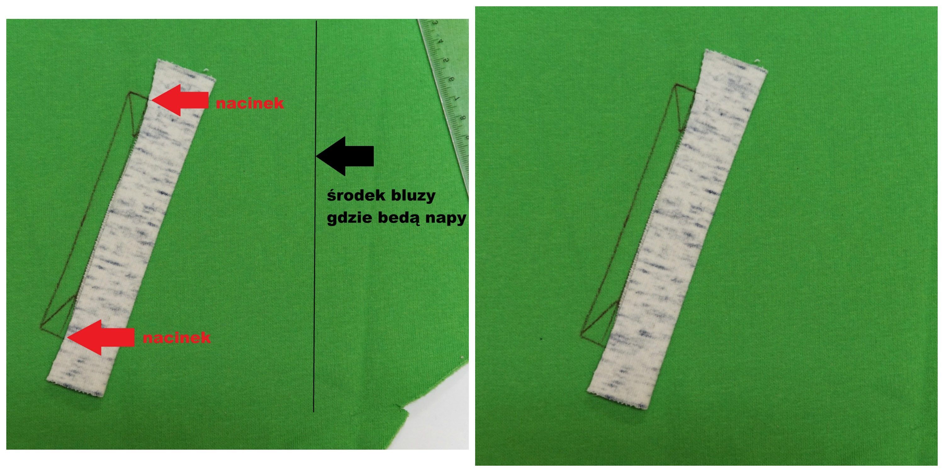 Kolejny krok to ułożenie zaprasowanej wypustki na wlocie kieszeni złożeniem w stronę środka bluzy (miejsca gdzie będą napy) a surowymi krawędziami do wlotu kieszeni. Krawędzie powinny dotykać linii środkowej zaznaczonej na wlocie