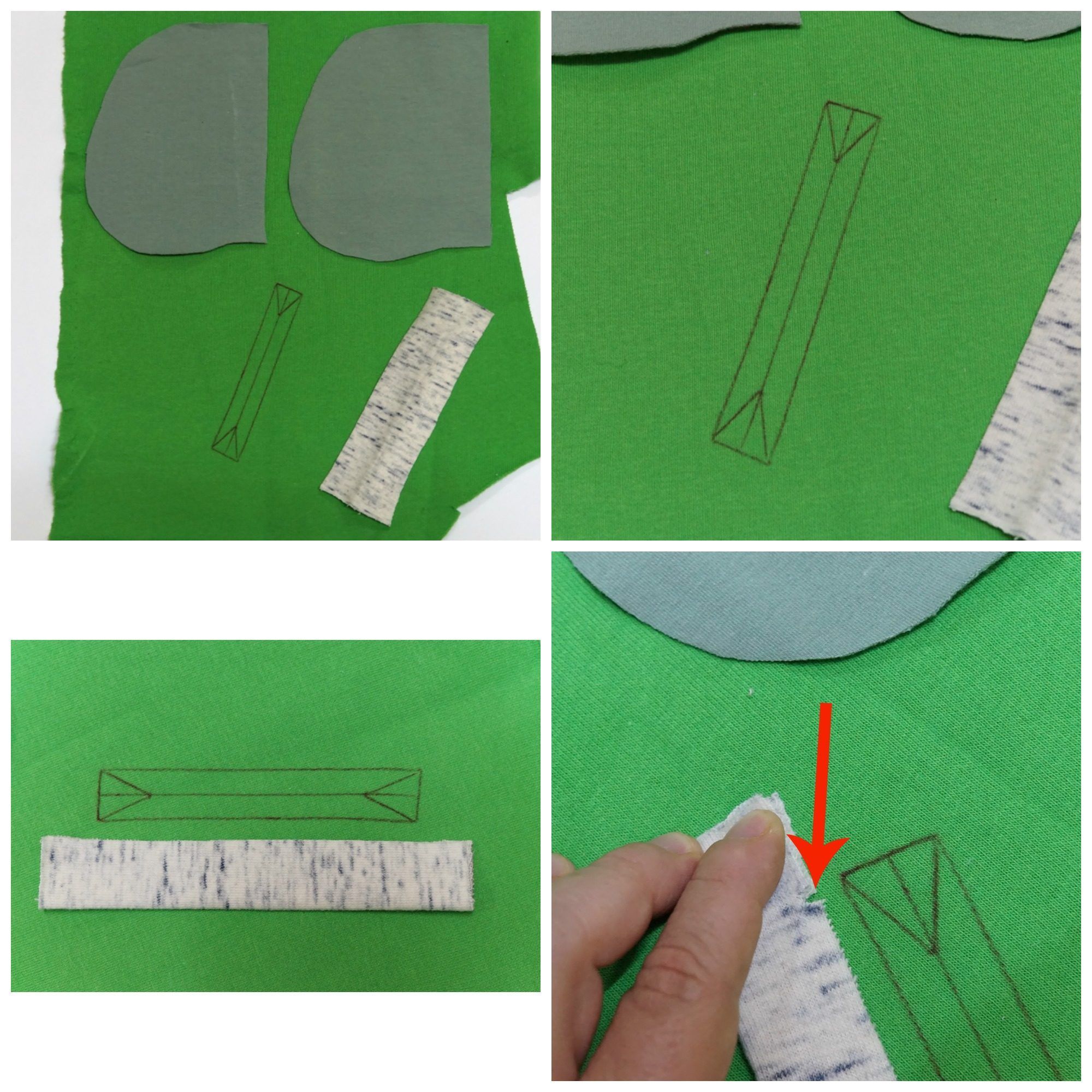 Powinniśmy wykroić cztery worki kieszeni - po dwa spodnie (większe) i dwa górne (mniejsze) oraz dwie wypustki, które należy złożyć na pół i zaprasować. Wypustka, oraz worki mają być większe od wlotu kieszeni, miejsca gdzie zaczyna się i kończy wlot zaznaczamy na wypustce nacinkami (pokazane czerwoną strzałką, są zaznaczone na wykroju).