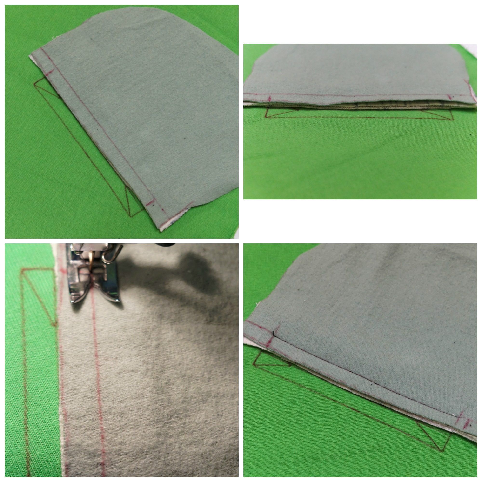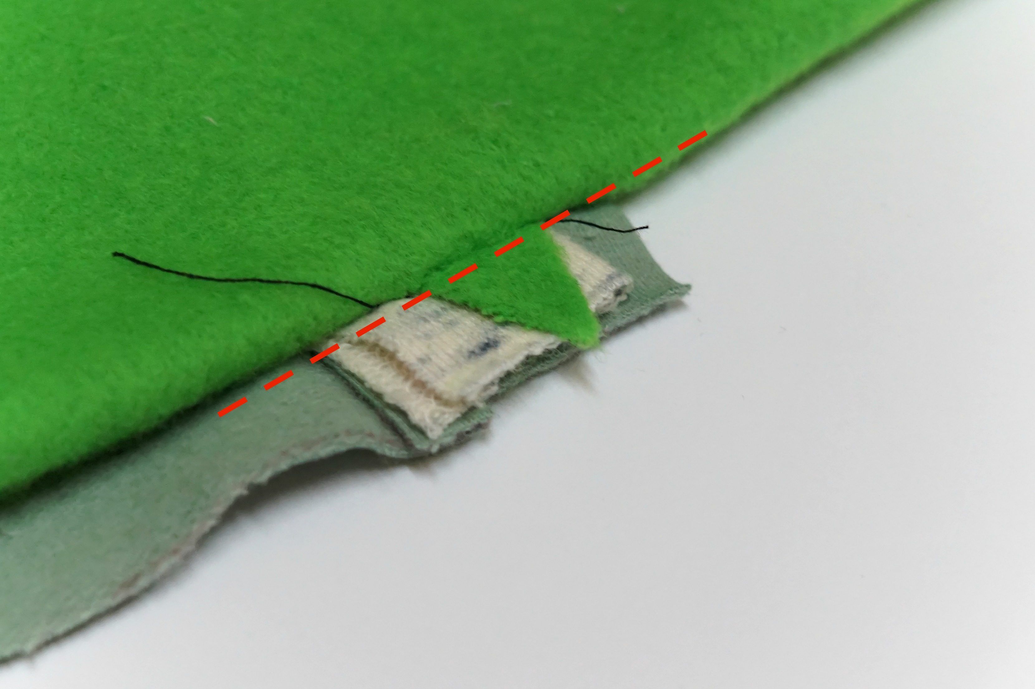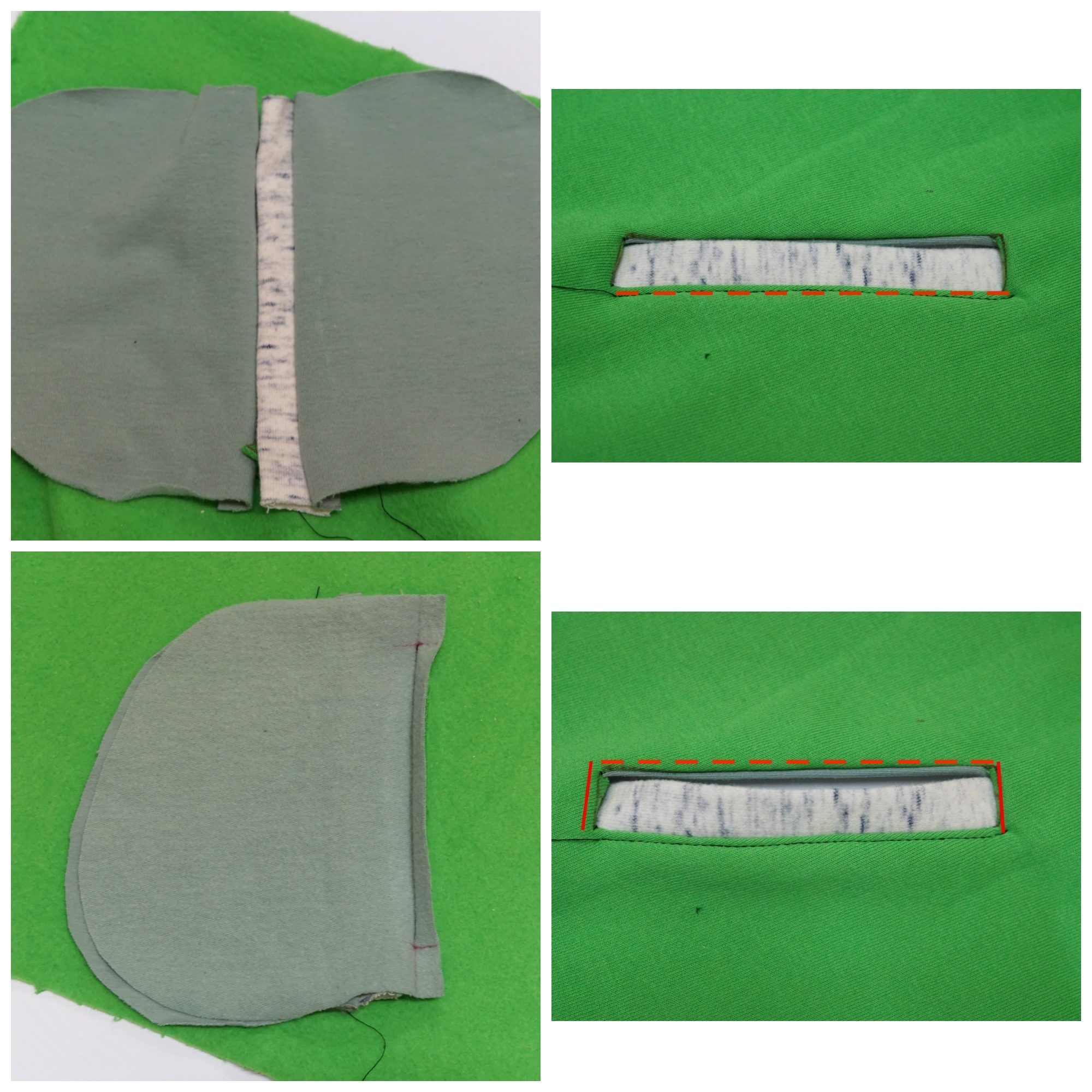 Jeśli natomiast chcemy zrobić stębnowanie naokoło wlotu najpierw rozkładamy worki kieszeniowe na boki, rozprasowujemy, następnie stębnujemy jednym ściegiem w zaznaczonym miejscu, po drugiej stronie wlotu.