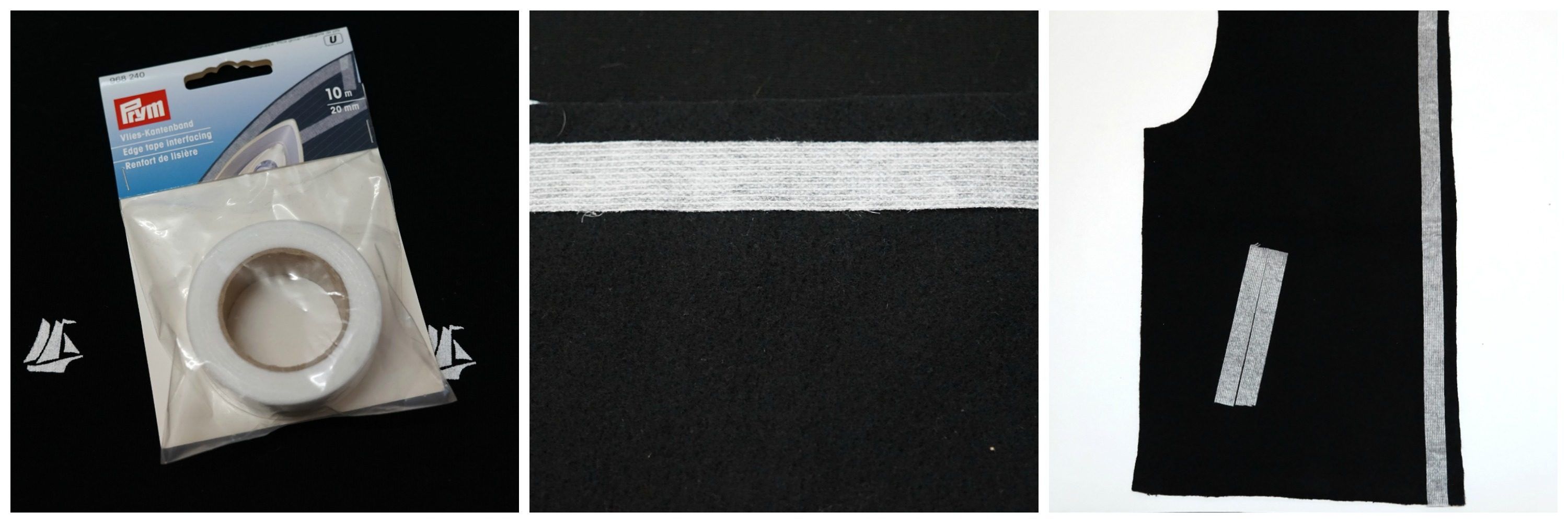 Najpierw naprasowujemy paski flizeliny na dwóch częściach przodu na których potem nabijemy napy, na dwóch małych częściach które przyszyjemy do ściągacza dolnego oraz na części, gdzie będzie kieszeń z wypustką, robimy to dla wzmocnienia materiału. Oczywiście flizelinę naprasowujemy na lewej stronie.