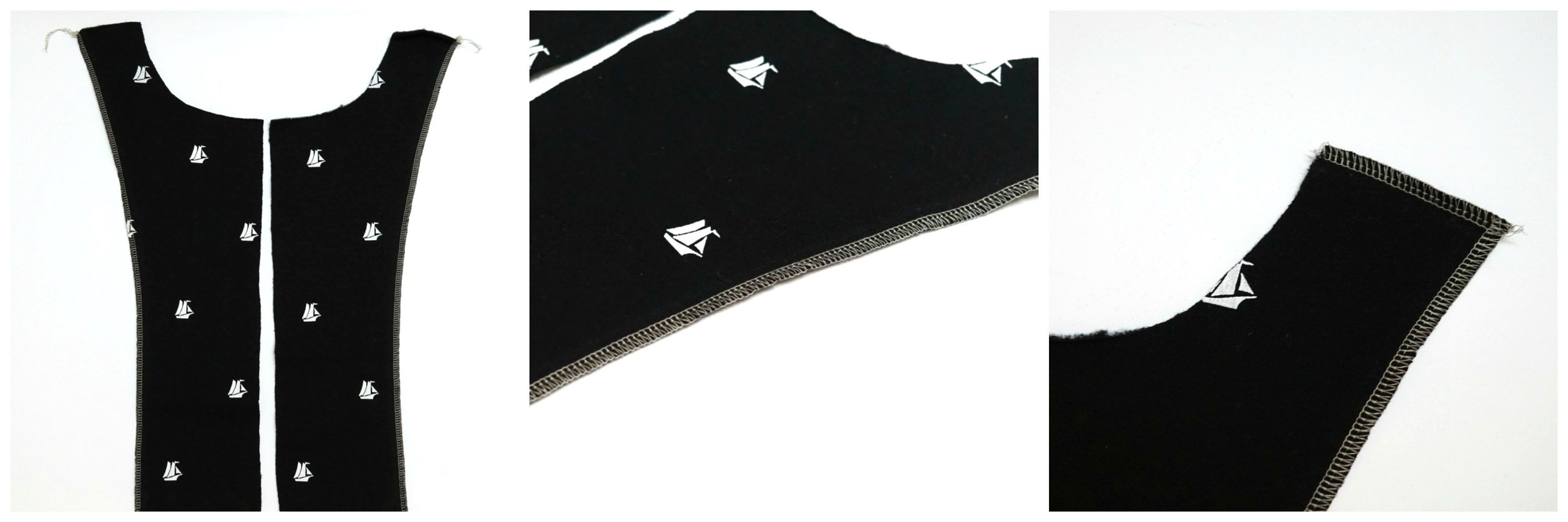 Teraz kiedy mamy wszytą stójkę nic nam się nie poprzesuwa przy wszywaniu obłożeń. Przypinamy je do obu części przodu i przyszywamy, następnie zawijamy pod spód