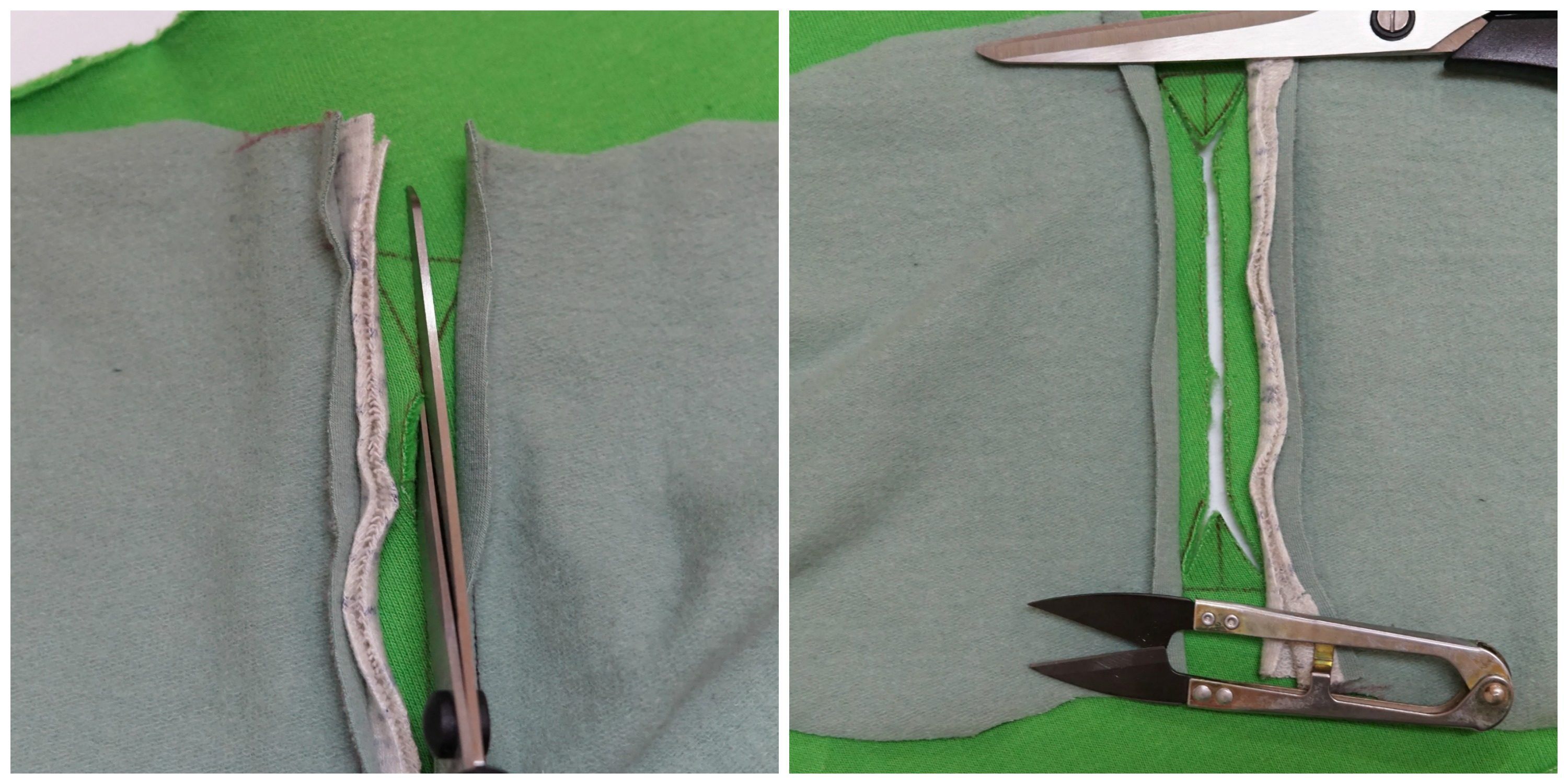 Teraz rozcinamy linię pomocnicza na środku wlotu, rozsuwając przyszyte worki, rozcinamy zakańczając nacięciami trójkątnymi, uważamy też, aby trójkątne nacięcia zakończyć około 1 - 2 mm przed szwami, którymi przyszyliśmy worki