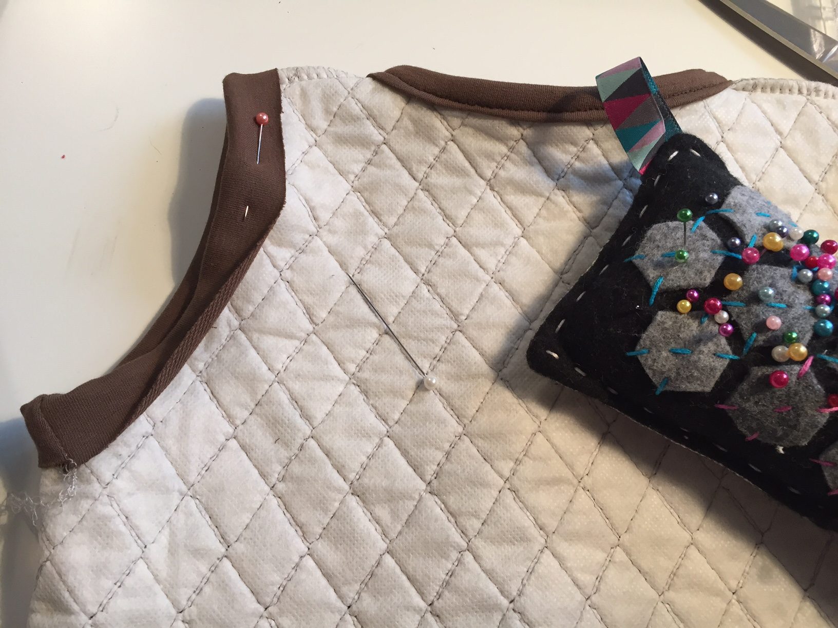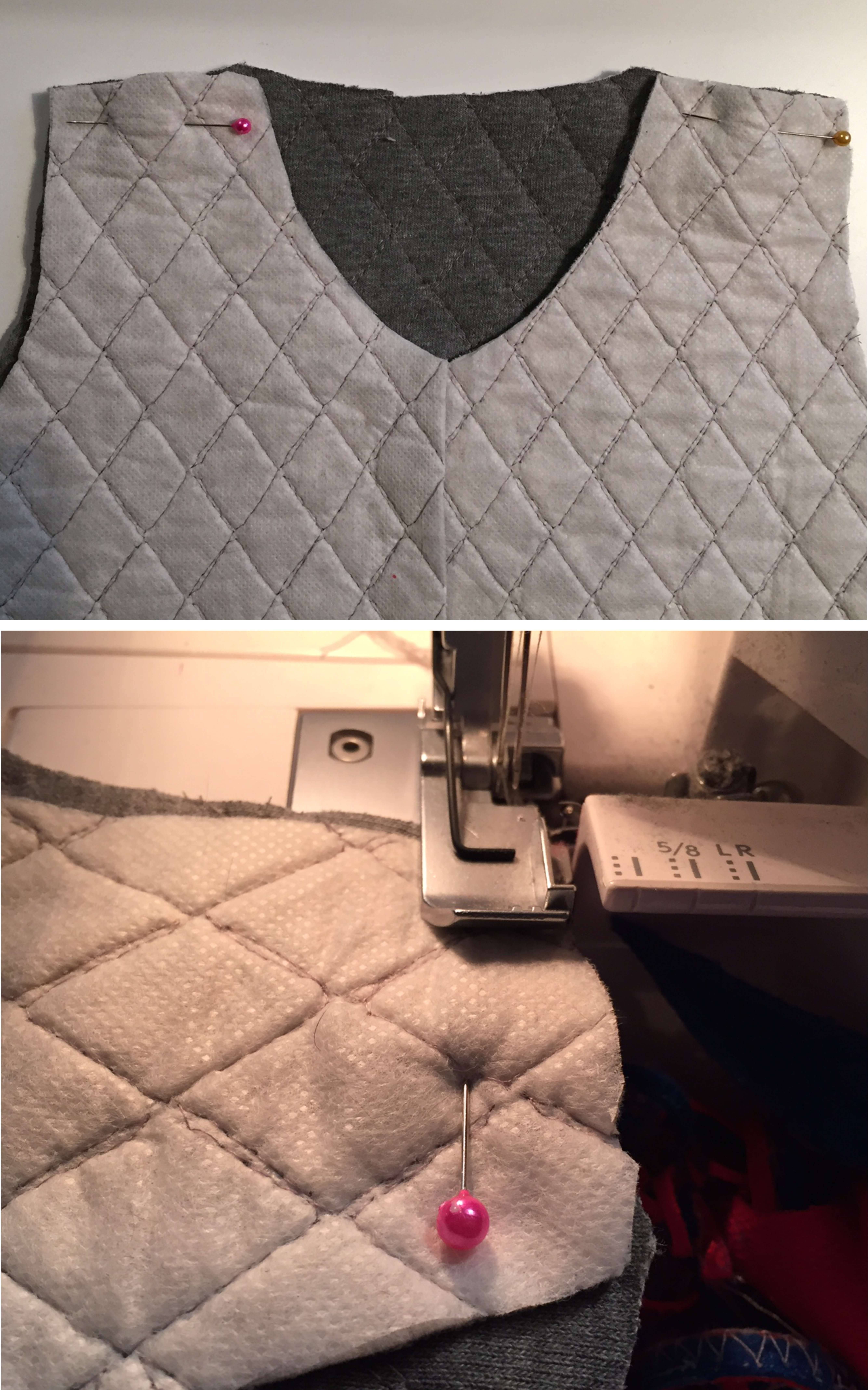 Przykładamy lamówkę prawa stroną do prawej strony bezrękawnika, spinamy szpilkami i zszywamy.