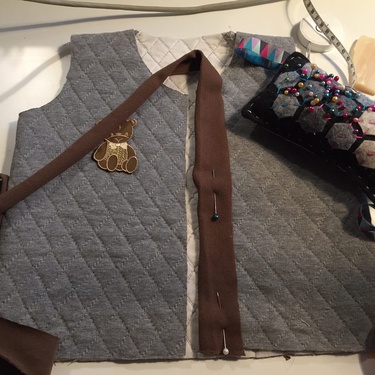 Spinamy bezrękawnik na ramionach i zszywamy.