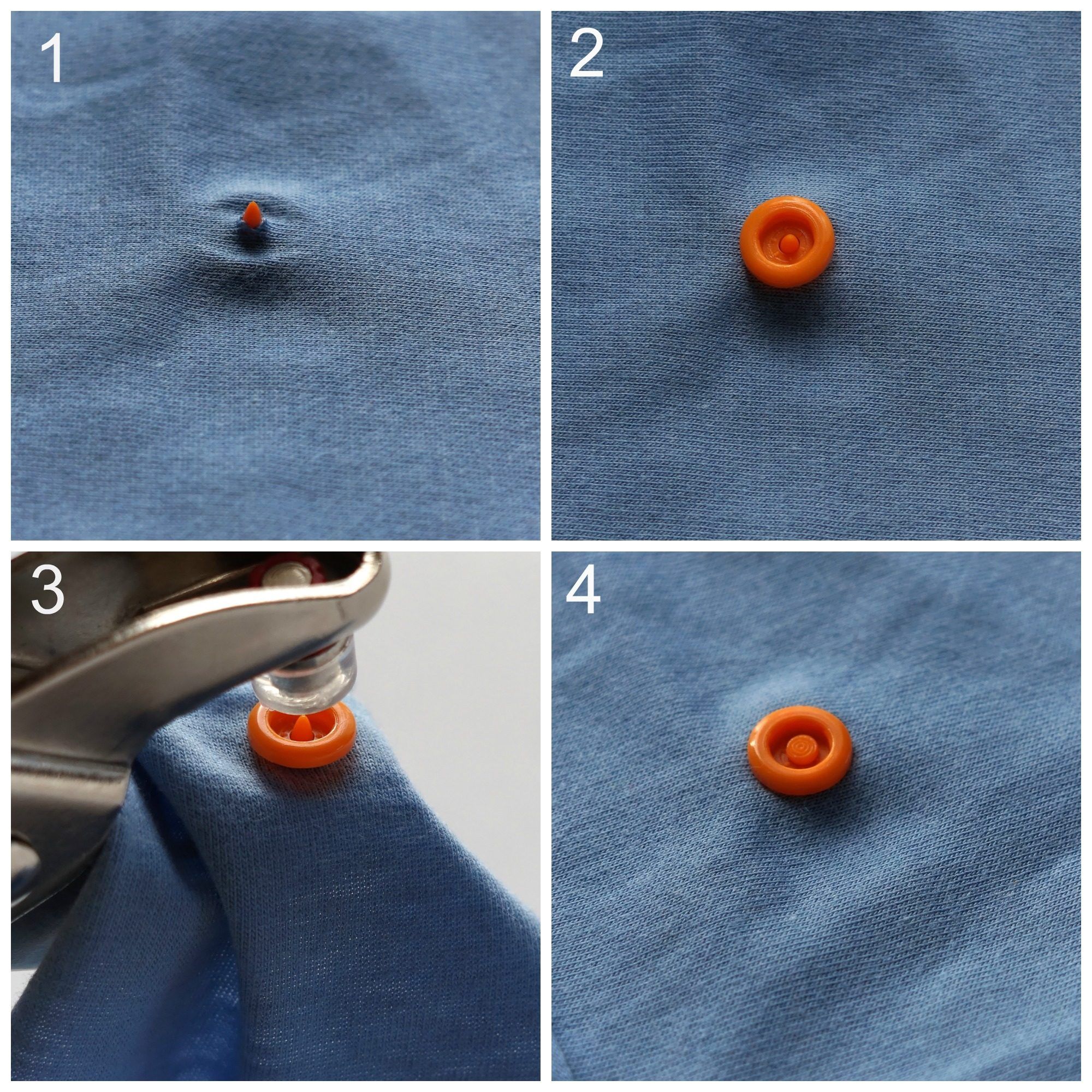 Napy plastikowe do napownicy Kam są takie same jak do napownicy PRYM ( te o średnicy 12,4 mm).Napę umieszczamy w materiale dokładnie w ten sam sposób jak przy nabijaniu napownicą Prym i mocno zaciskamy. Gotowe: