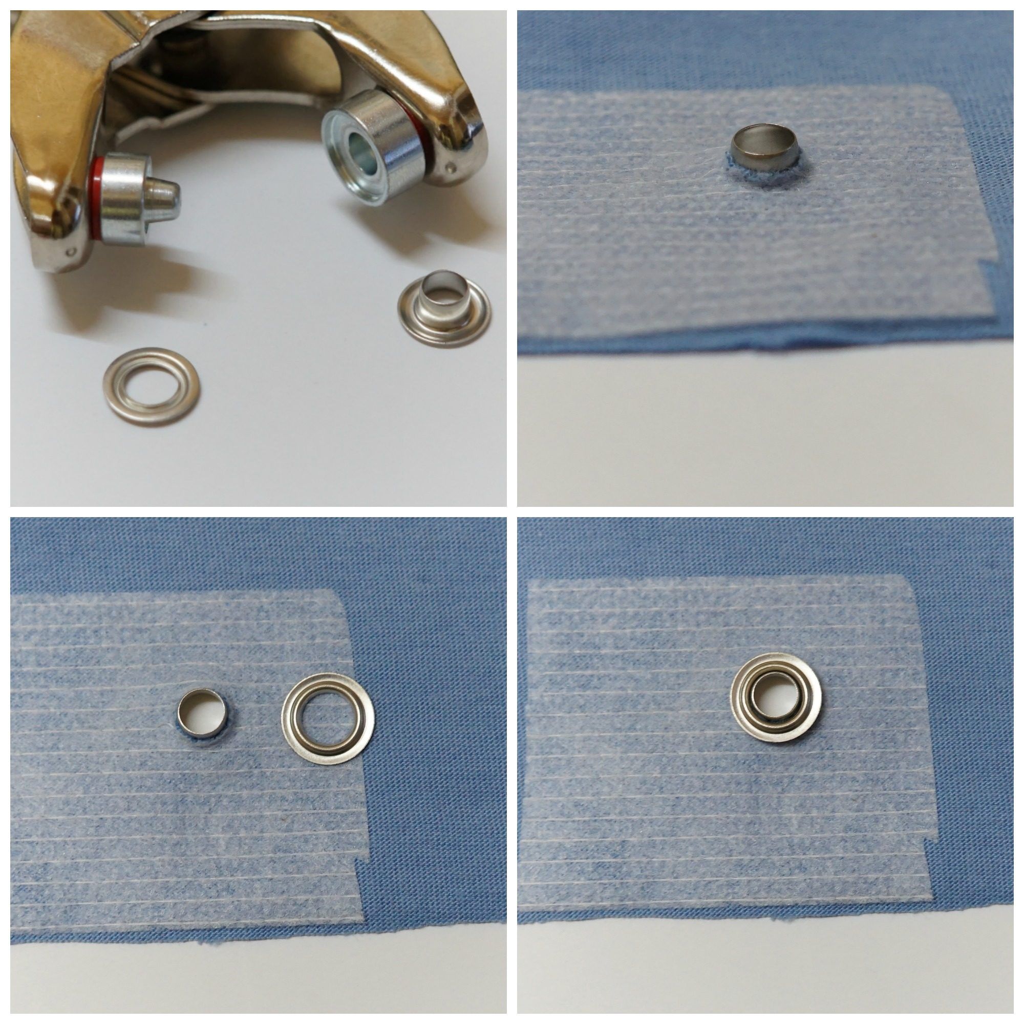 Montujemy końcówki w napownicy, robimy w materiale zabezpieczonym flizeliną otwory (tutaj średnica oczka to 5 mm więc powinniśmy użyć dziurkacza z końcówką 4 / 4,5 mm nie więcej). Przekładamy przez otwór jedną z części oczka, nakładamy na nią drugą i zaciskamy mocno szczypce
