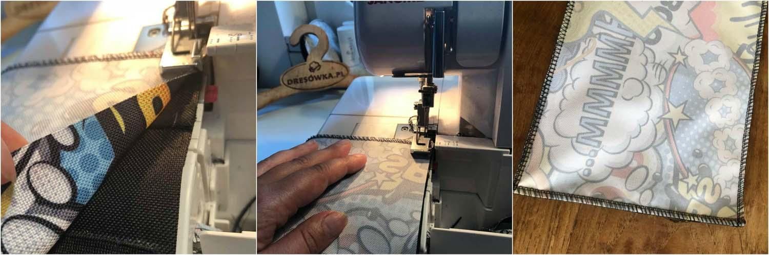Zaczynamy od przygotowania dodatkowego paska o szerokości 5 cm, odcinamy go z GŁADKIEJ TKANINY WODOODPORNEJ (wystarczy przyłożyć pasek z tkaniny drukowanej bądź wigofil i odciąć z gładkiej tkaniny nadmiar).