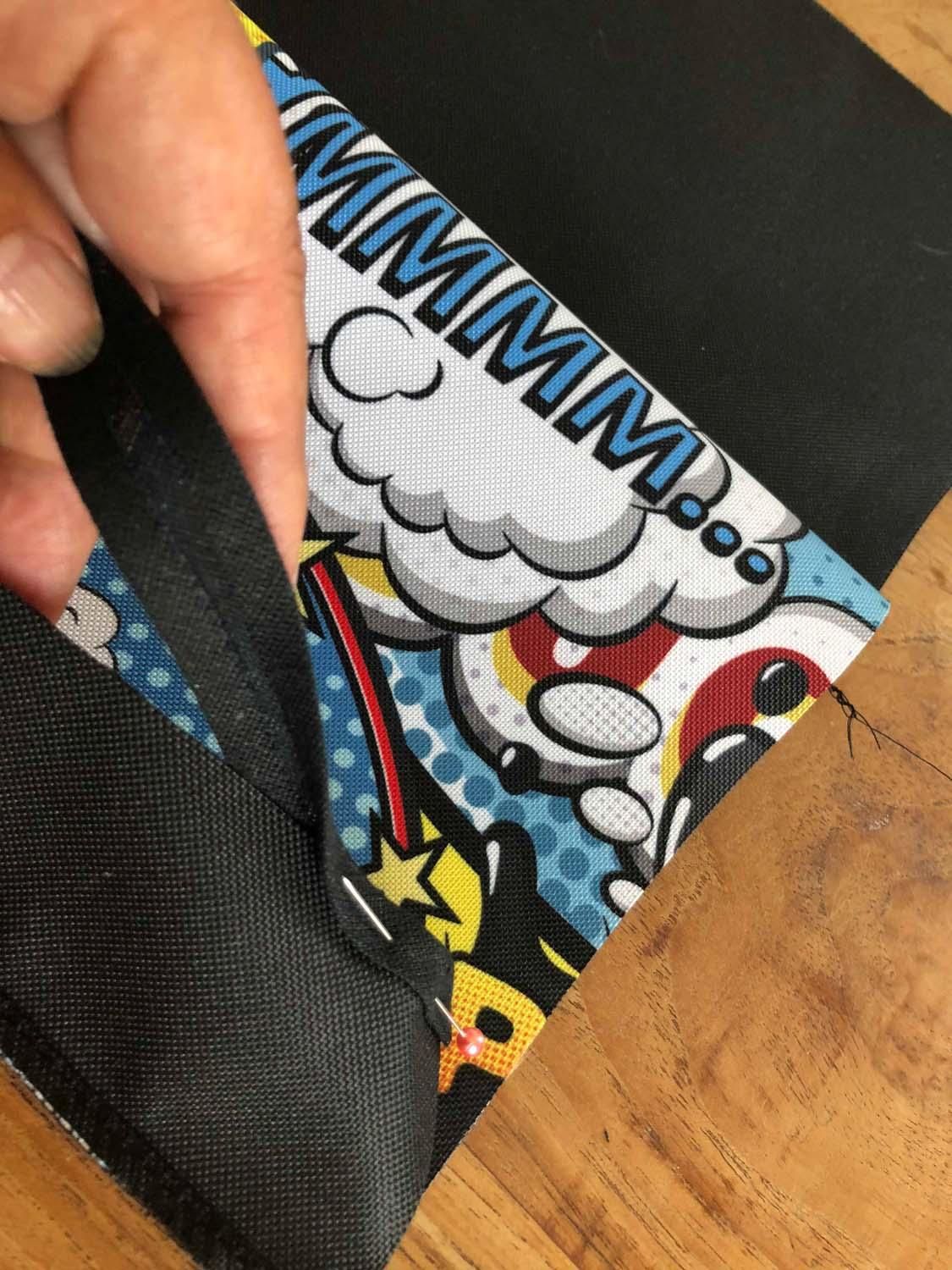 Wszystkie trzy podstawowe pasy (wigofil + pas tkanina gładka + pas tkanina drukowana) układamy na sobie w kolejności pokazanej na zdjęciu, spinamy i zszywamy na jednym z długich boków, będącym górą piórnika / przybornika.