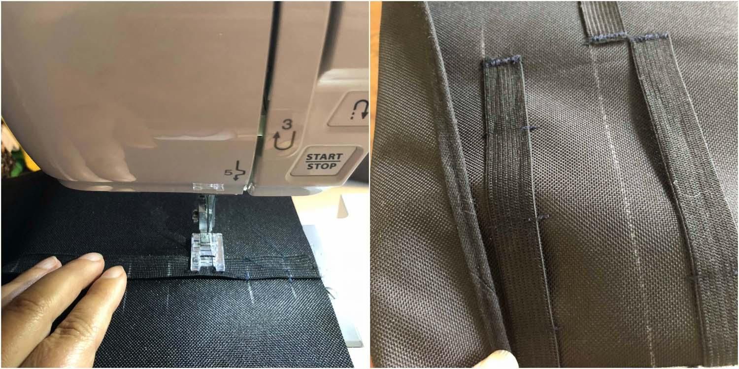 Kolejny krok to przyszycie na prawej stronie gładkiej tkaniny gumek, w krótych musimy wyznaczyć odstępy między przeszyciami. Gumki przyszywamy do tkaniny gładkiej i wigofilu znajdującego się pod spodem.
