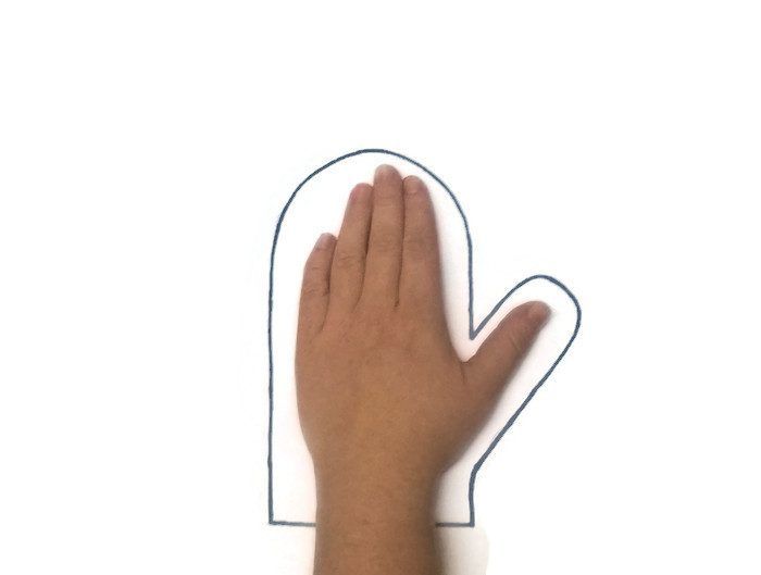 Przykładamy odcięty kciuk rękawiczki najpierw do górnej części potem do dolnej i obrysowujemy