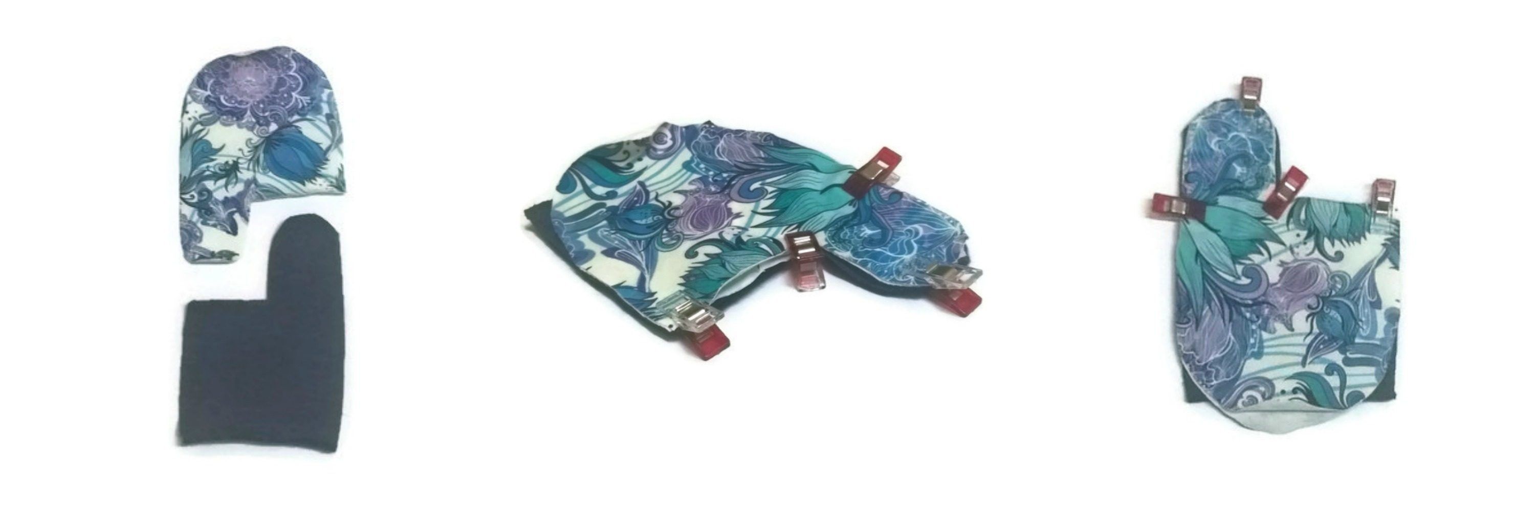 Kolejny krok to złożenie zszytej części z trzecią częścią rękawiczki również prawymi stronami do środka i zszycie wszystkiego razem