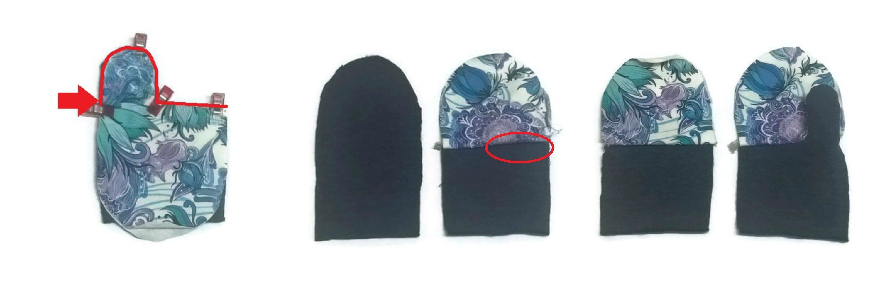 Zszywamy tylko w miejscu zaznaczonym czerwoną linią - na środkowym zdjęciu zaznaczyłam miejsce gdzie znajduje się kciuk a na ostatnim wyciągnęłam go oby pokazać