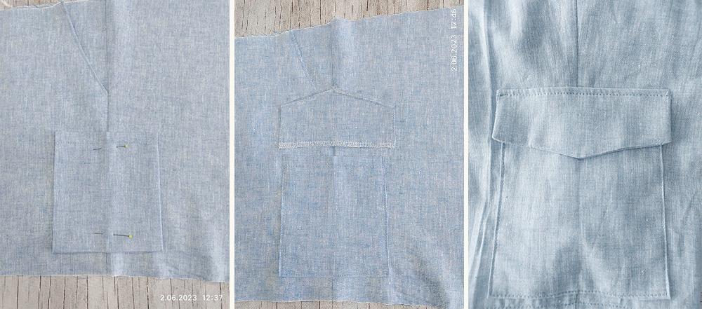 4.Wyznacz środek kieszonki i patki .Przyszyj kieszonkę tak aby jej środek przebiegał na szwie bocznym spodenek. Patkę ułóż nad wlotem kieszonki na płasko w odległości 1cm i przyszyj tuż za overlockiem. Teraz zaprasuj ją w dół i przymocuj szwem na stopkę.