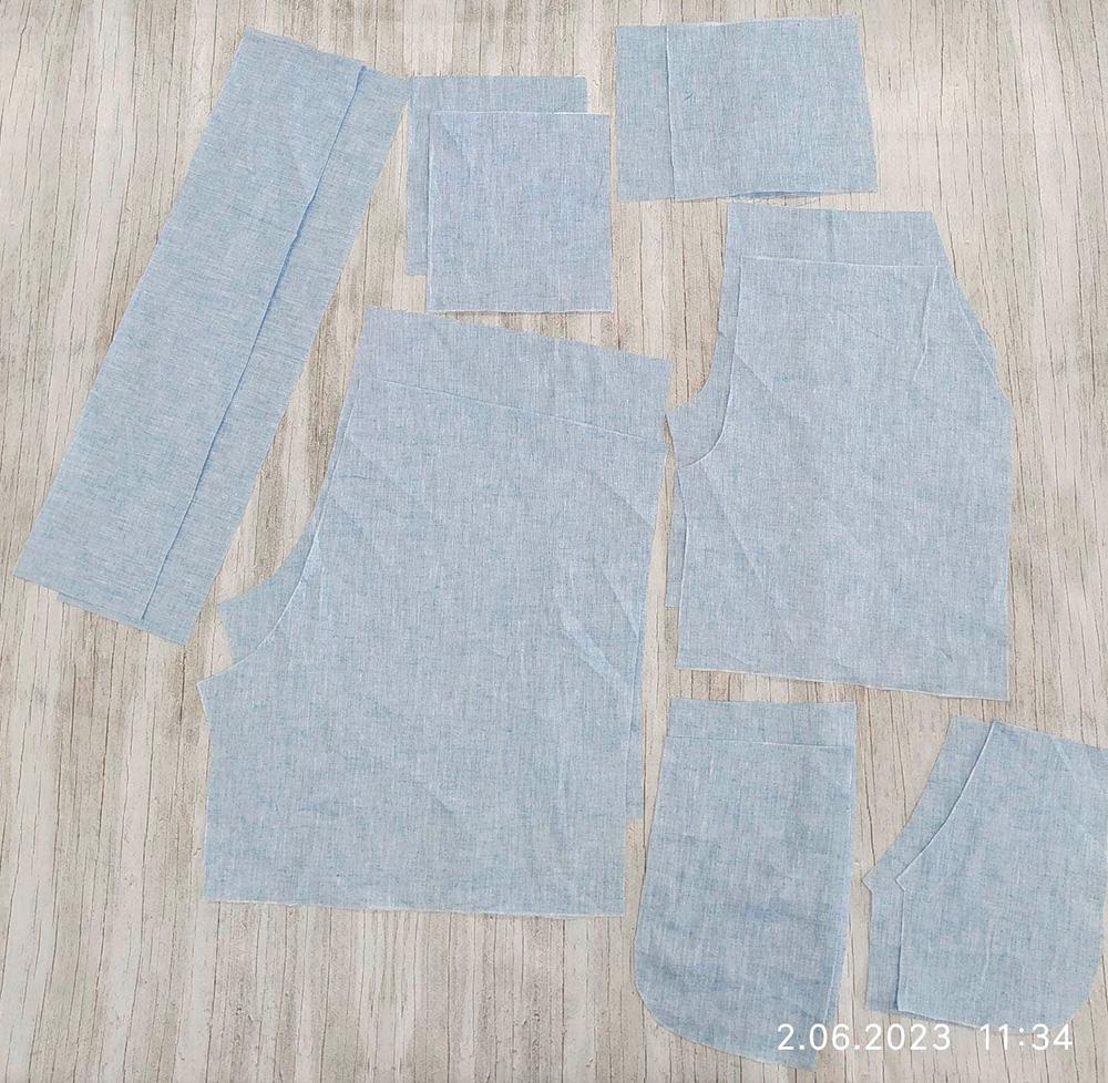 1.Mniejszy element kieszeni ułóż na przodzie prawą strona do prawej, zszyj szew wlotu kieszeni, powstały zapas rozprasuj, przewiń na drugą stronę i przestebnuj na stopkę (ok 0,5cm). Worek kieszeniowy doszyj do pierwszego elementu kieszeni i obrzuć powstały zapas na overlocku, czynność powtórz z drugiej strony.