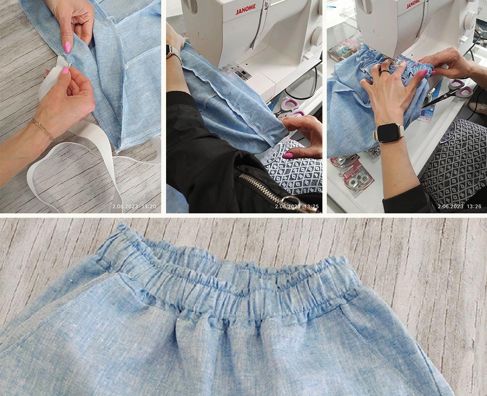 7.Pasek zszyj z dwóch elementów, zaprasuj po długości i wszyj pozostawiajac otwór na wciagniecie gumy.