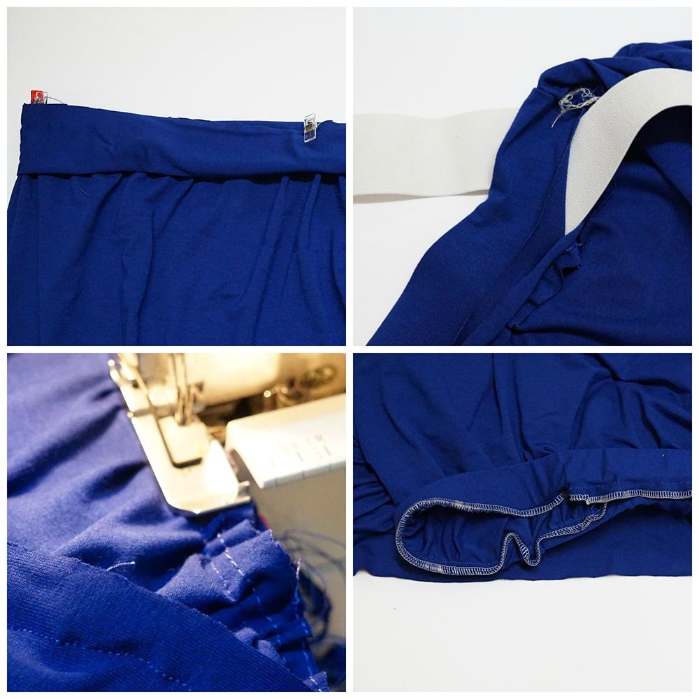 Zostawiamy 4-5 cm otwór przez który wciągniemy gumkę do tunelu. Po wykonaniu tej czynności zszywamy otwór. Zapasy na szwy obrzucamy overlockiem/albo ściegiem owerlokowym/zygzakiem.