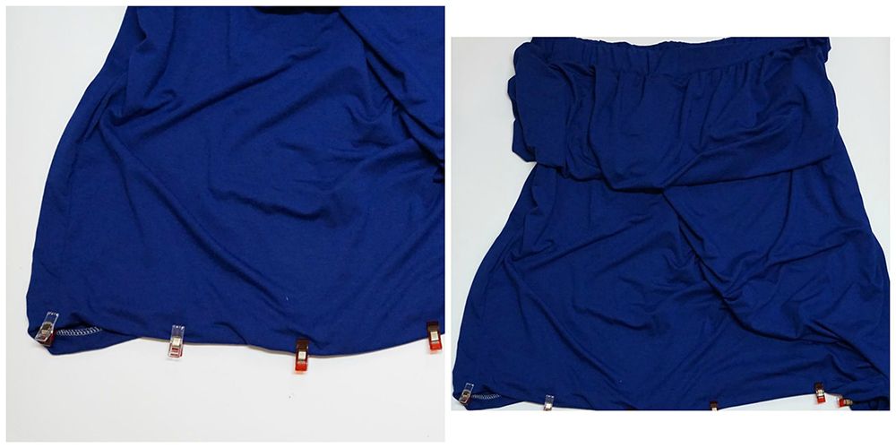Zszywamy go na lewej stronie (jego krótszy bok) i składamy na pół wzdłuż długiego boku. Przypinamy tunel do zmarszczonego brzegu spódnicy prawą do prawej, pamiętamy jeszcze o równomiernym rozłożeniu marszczenia.