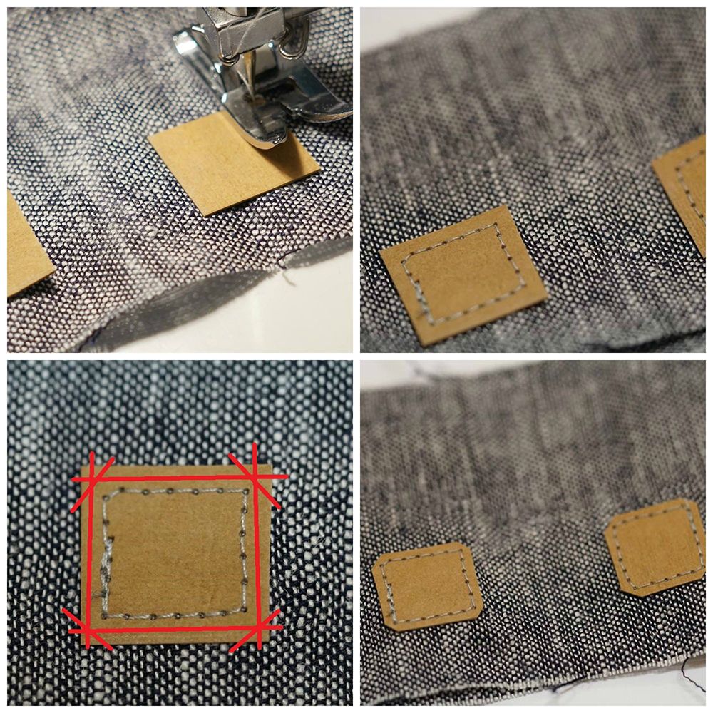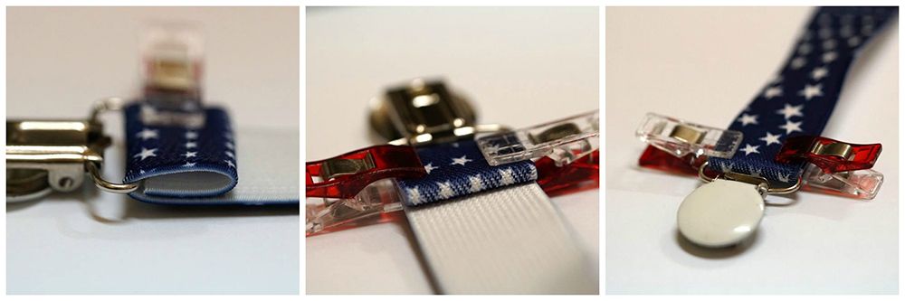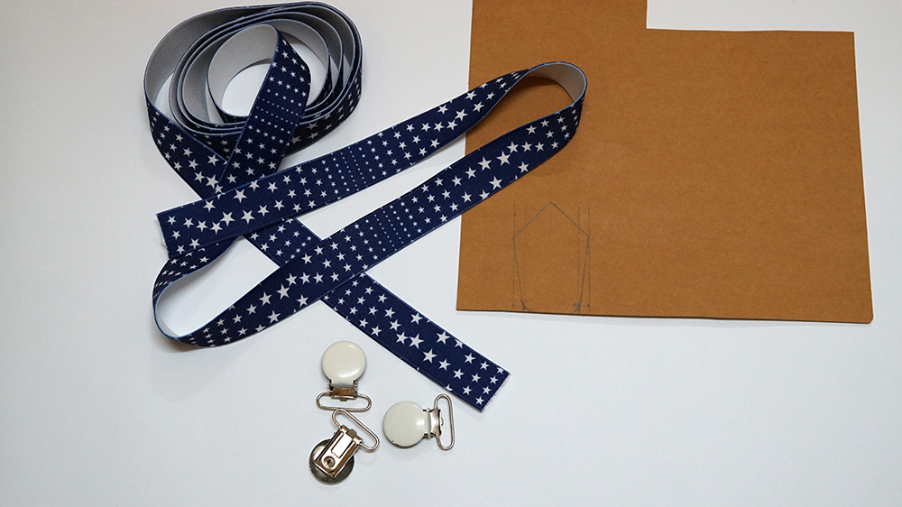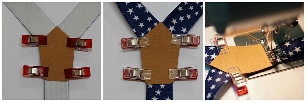 Pozostaje nam przyszyć środkową część szelek wyciętą z washable kraft paper. Dobieramy odpowiedni kolor nici, układamy części jak na zdjęciu poniżej, spinamy i zszywamy.