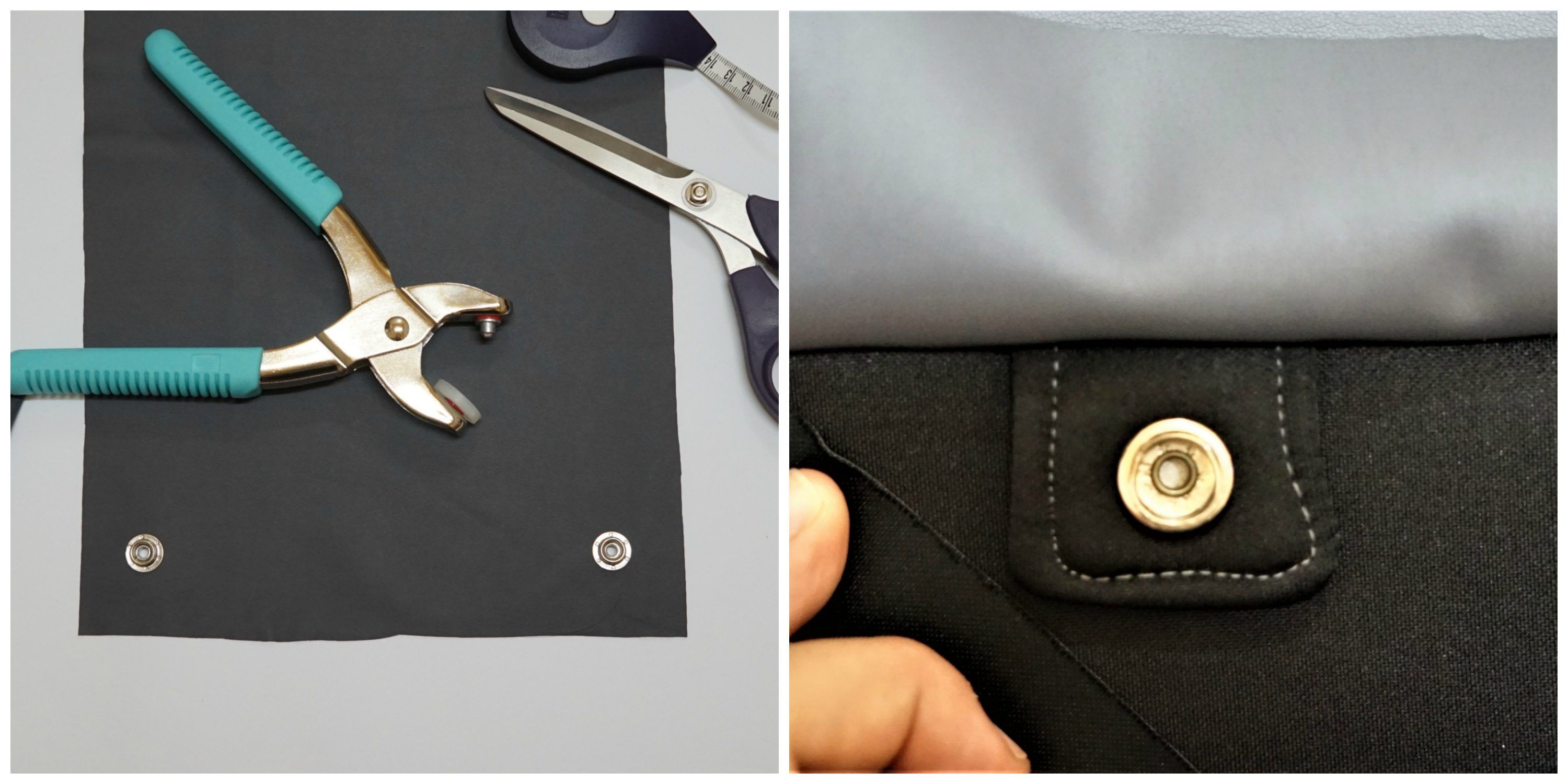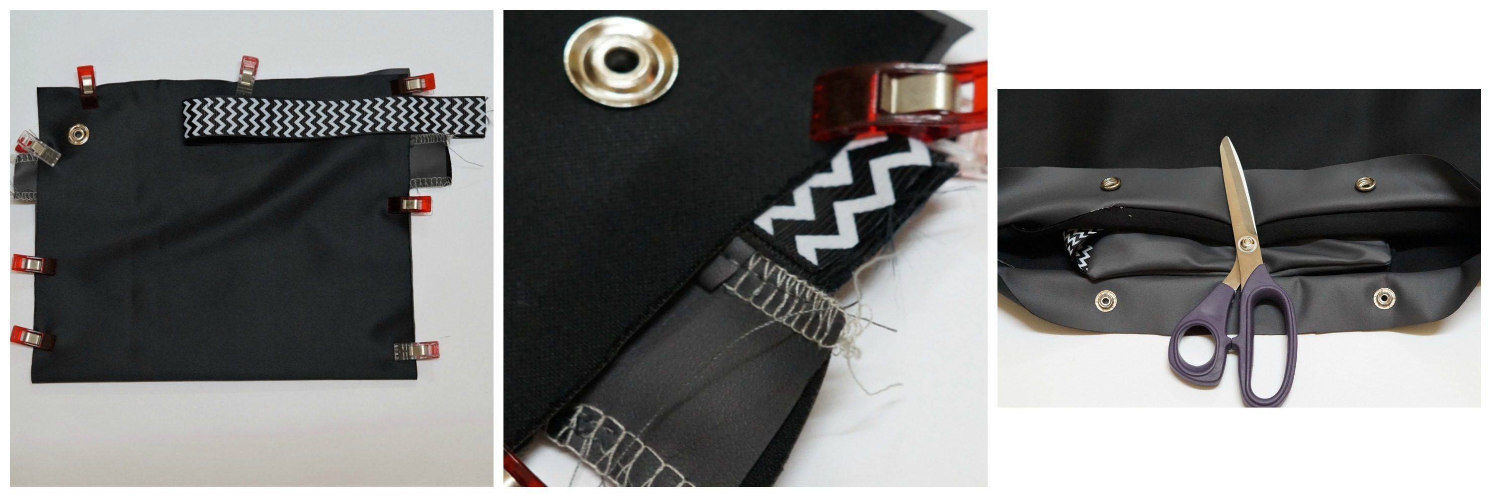 Po zszyciu wszystkich elementów nabijamy u góry dwie napy, które będą zamknięciem torebki (pamiętamy oczywiście, aby nabić je około 2,5 cm od brzegu, bo przecież na końcu będziemy jeszcze zszywać podszewkę i wierzchnią warstwę torby.