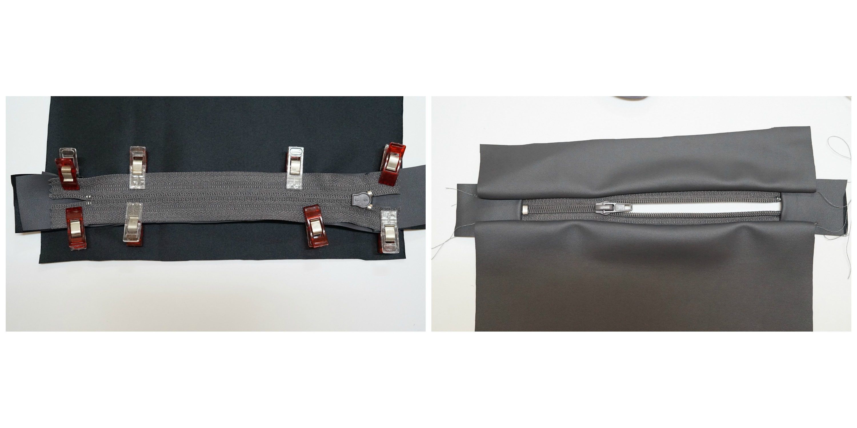 Najpierw wszywamy zamek do prostokąta który został podzielony wcześniej na dwie części. Pamiętamy o złożeniu dwóch małych prostokątów i umieszczeniu przy końcówkach zamka przed wszyciem: