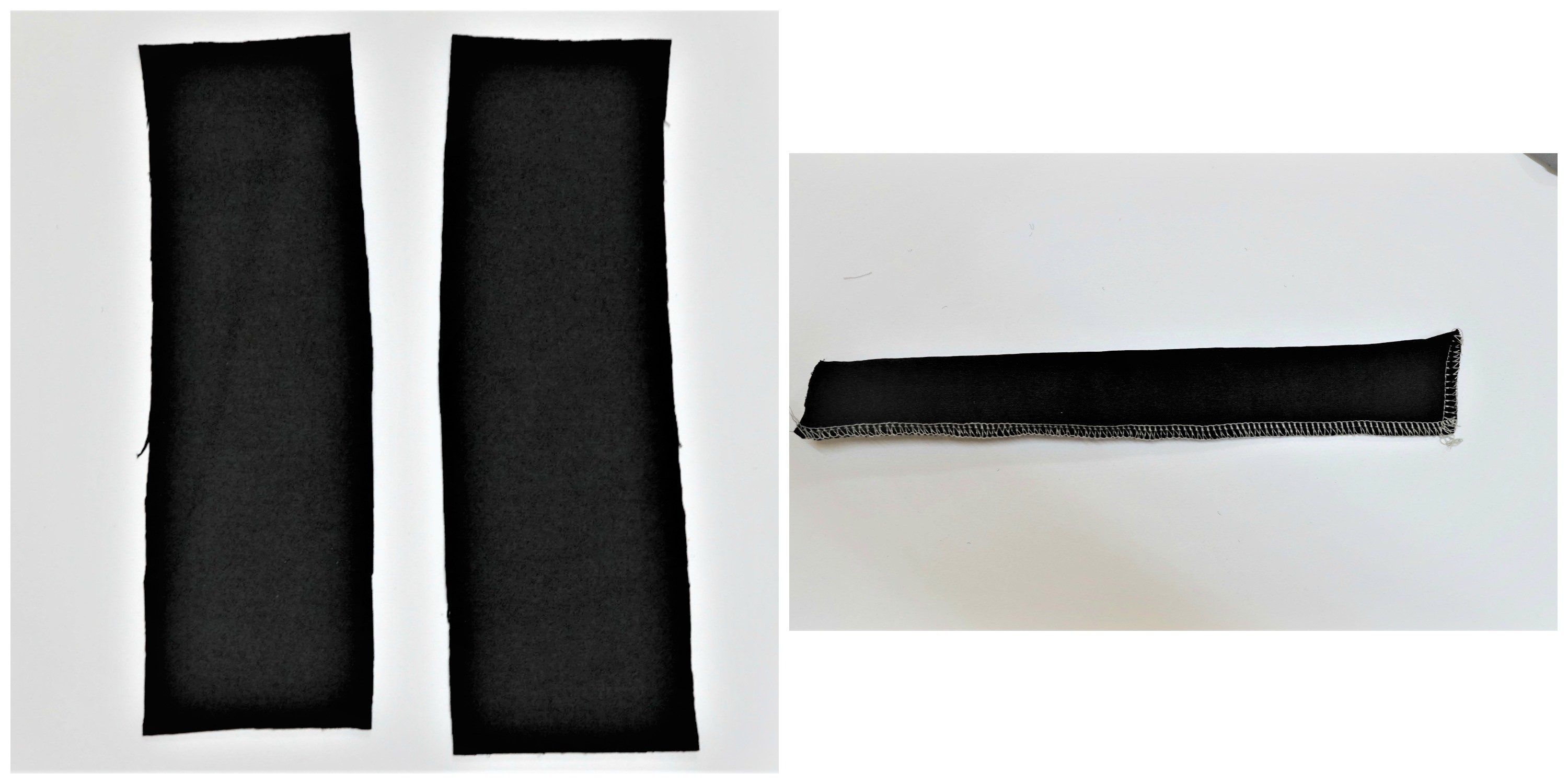Zaczepy to większe niż poprzednio prostokąty z pianki, będą one służyć do zaczepiania torby na rączce/rączkach wózka dziecięcego). Złożyłam prostokąty prawymi stronami do środka i zszyłam, zostawiając na dole niezszytą część przez którą wywinę je na prawą stronę:
