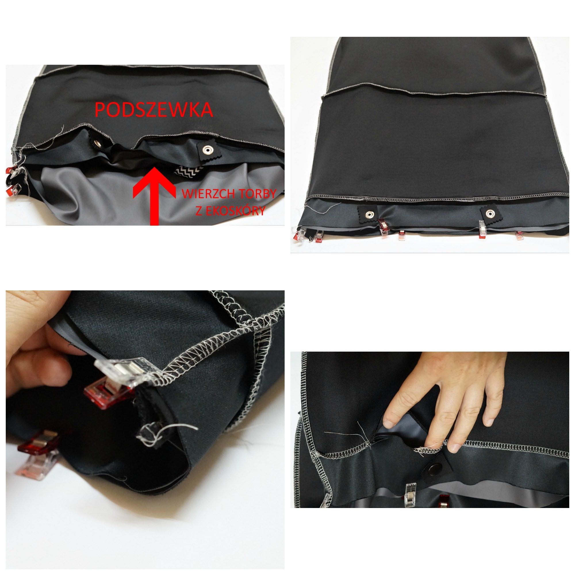 Na koniec włożyłam do podszewkowej części torby torbę z ekoskóry, prawą stroną do prawej strony podszewki. Przy szwach bocznych u góry wpięłam uszyte wcześniej zaczepy i zszyłam naokoło (pamiętamy, że otwór na wywrócenie torby na prawą stronę zostawiliśmy wcześniej w łączeniu podszewki z ekoskórą w środku torby):