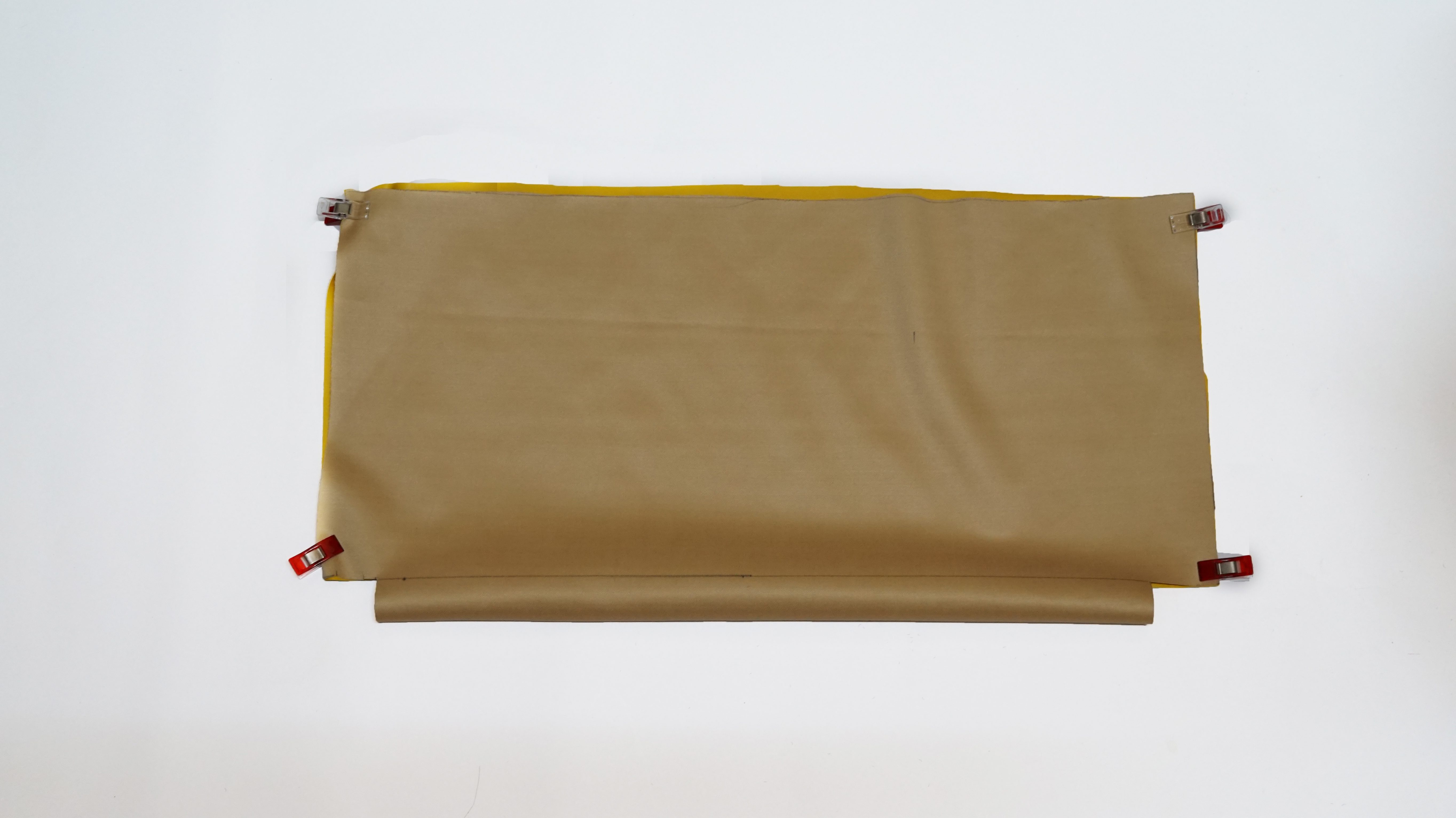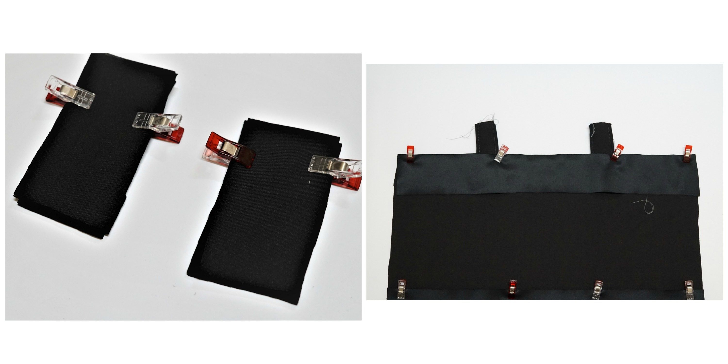 Pasek wszywamy w dolne niezszyte jeszcze rogi torby, wkładając go do środka torby, tak, aby przez niezszyte dolne rogi wyciągnąć po kilka cm paska. Przypinamy klipsami:
