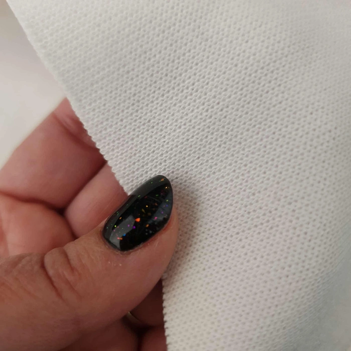 The fabric is double-sided: the reverse side is perfectly smooth and soft to the touch, while the face side resembles a delicate sweater knit (flat, ribbed), providing an interesting visual effect.