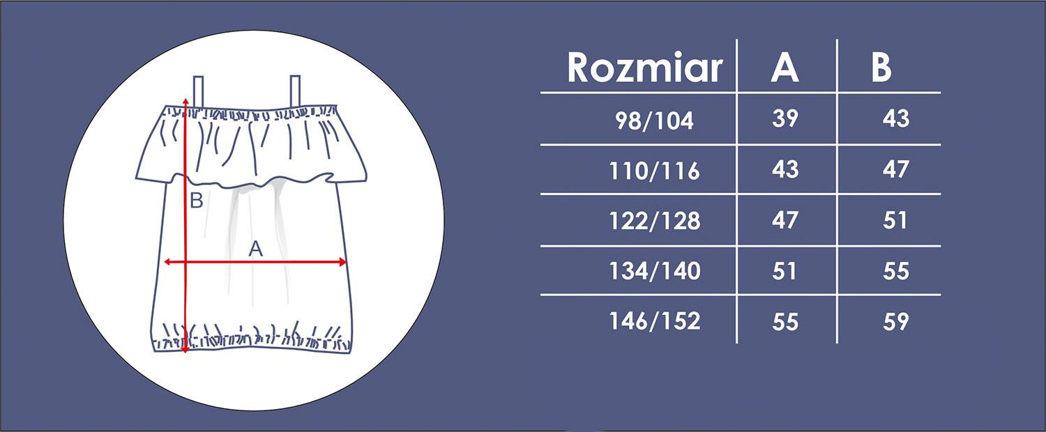Rozmiary są zgodne z tabelą wymiarów, którą podaliśmy poniżej. Zestaw “Bluzka hiszpanka Sara” zawiera zapas na szwy.