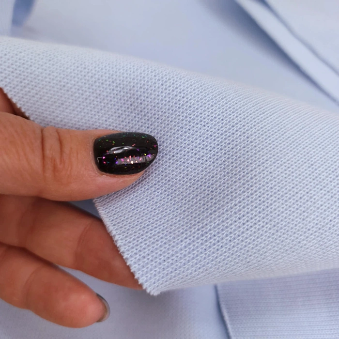Materiał jest dwustronny, spód jest idealnie gładki i miękki w dotyku, strona wierzchnia przypomina delikatny swetrowy splot (płaski, prążkowany), zapewniając ciekawe wrażenia wizualne. Jest bardzo przyjemny dla skóry, niezwykle komfortowy w noszeniu, dobrze dopasowuje się do sylwetki i przyjemnie otula. Lekko elastyczny, mięsisty, niezwykle miękki i przyjemny w dotyku.