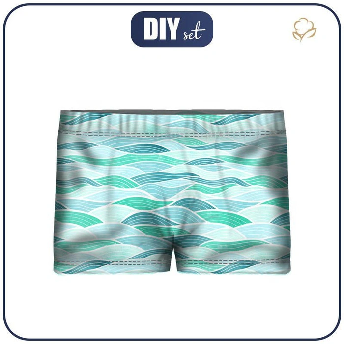 - Nadrukowane na lycrze gotowe elementy wykroju kąpielówek dla chłopca (wystarczy wyciąć i zszyć)
