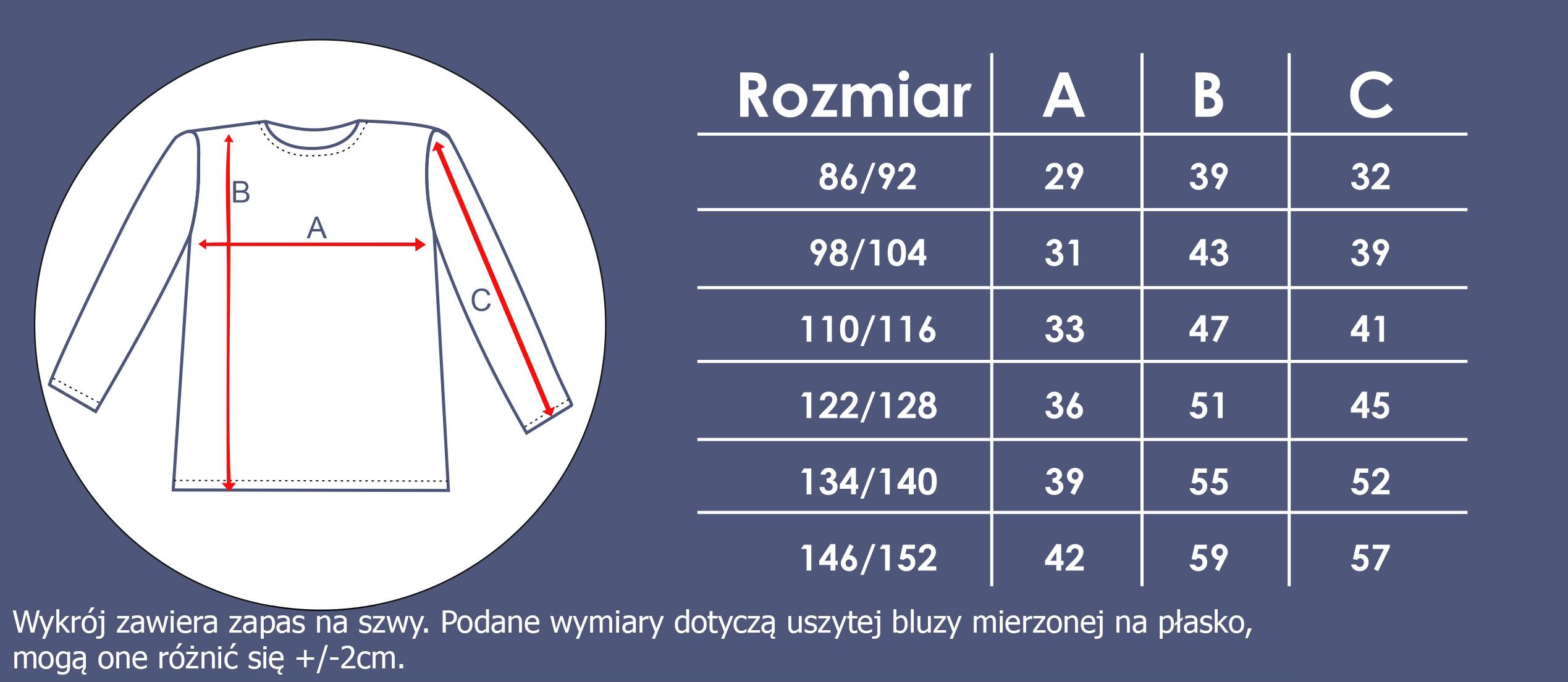 W zestawie znajduje się materiał niezbędny do uszycia dziecięcej bluzki typu longsleeve.