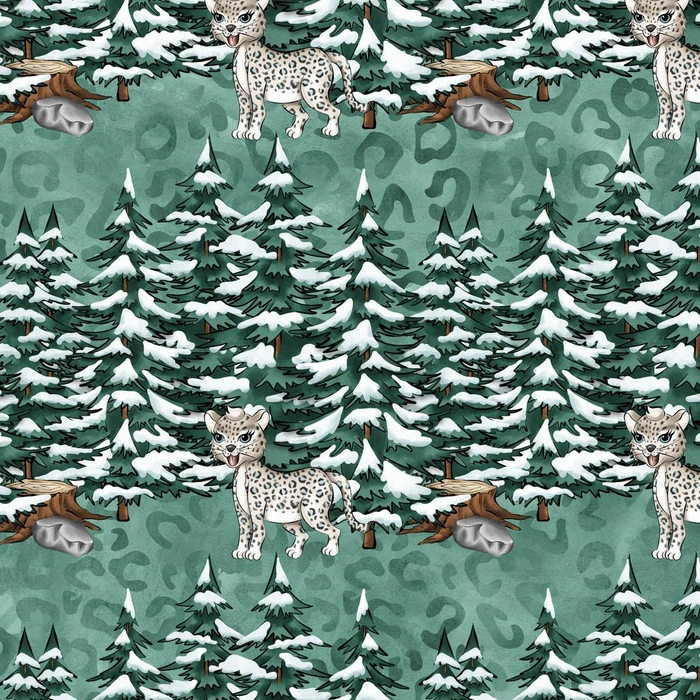 Materiał do szycia z nadrukowanym wzorem PANTERY W LESIE (PANTERY ŚNIEŻNE).
