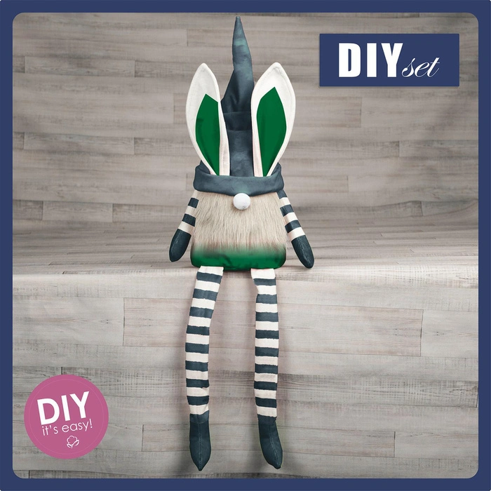 W zestawie znajdują się materiały niezbędne do uszycia wiosennego skrzata z uszami i długimi nogami.