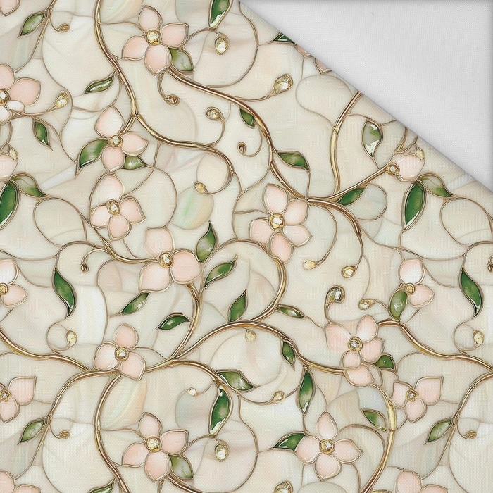 Tkanina jest lekko błyszcząca. Z wierzchu gładka, od spodu wykończona delikatnym gumowaniem. Dzięki dodatkowemu wykończeniu materiał nie chłonie wody, wilgoci, nie ulega łatwemu zabrudzeniu.