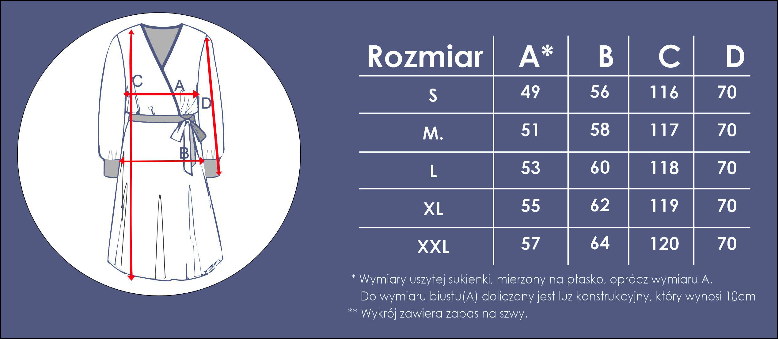 Nasza sukienka kopertowa to synonim kobiecości, podkreślający dekolt, a także talię. Długi rękaw i długość pozwalają na ubranie jej również w chłodniejsze dni. Jeśli szukasz czegoś na co dzień do pracy, ale także coś bardziej eleganckiego na randkę czy spacer, to ta sukienka wydaje się być oczywistym wyborem. Stwórz swój look z sukienki, skórzanych dodatków i ciężkich butów lub wręcz przeciwnie - z delikatną biżuterią i szpilkami. Możesz użyć guzików lub gumy w mankietach, a także gumy w pasie, żeby dopasować ją idealnie do swojego stylu. Dodatkowo z tego projektu możesz uszyć DWIE różne sukienki - z falbaną na dole i bez.