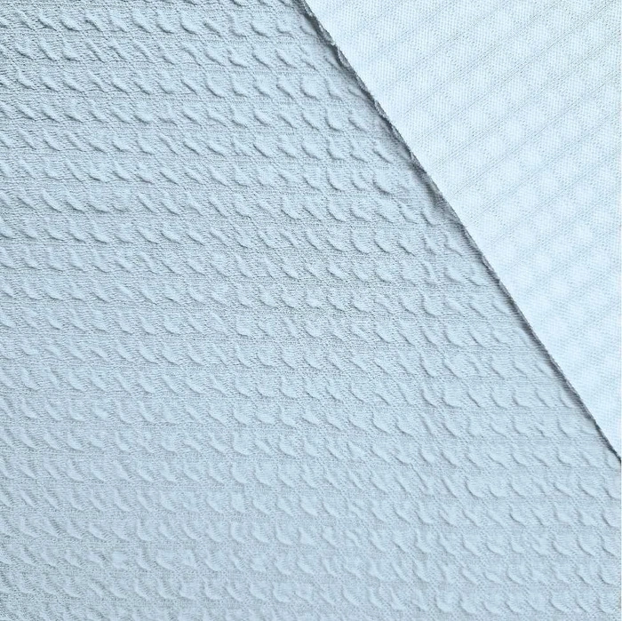 Vysoce kvalitní úplet s charakteristickou strukturou „vafle“ a výrazným 3D efektem. Materiál je masivní, neprosvítá a je výjimečně příjemný na dotek – z lícové strany měkký s texturou, z rubové strany hladký. Díky příměsi lycry je úplet pružný, skvěle se přizpůsobí postavě a drží svůj tvar. Vysoký obsah bavlny zajišťuje prodyšnost pokožky.
