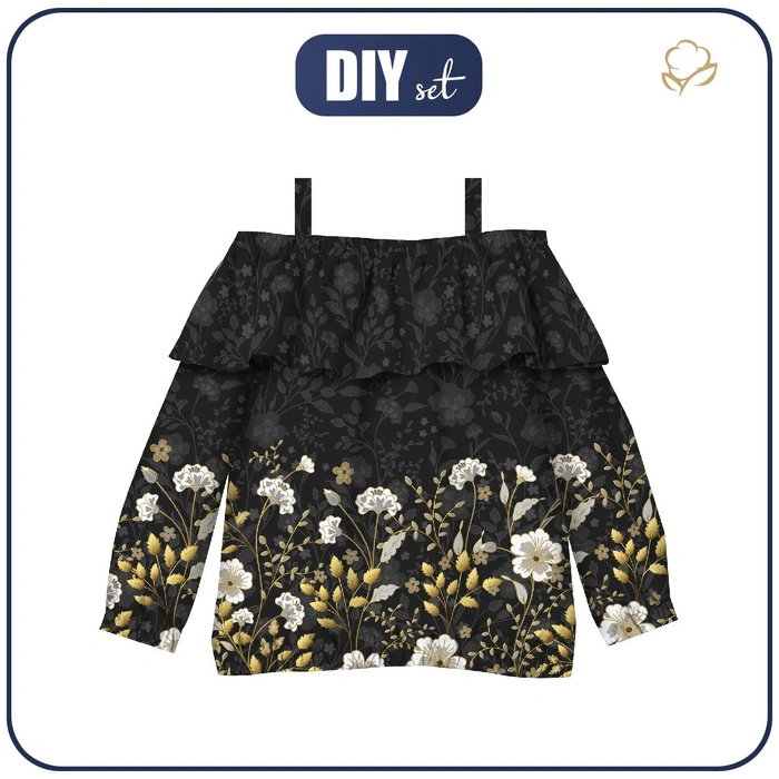 Bardot halenka (VIKI) - KVĚTY (vzor 8) / černá - Sada šití - 146-152