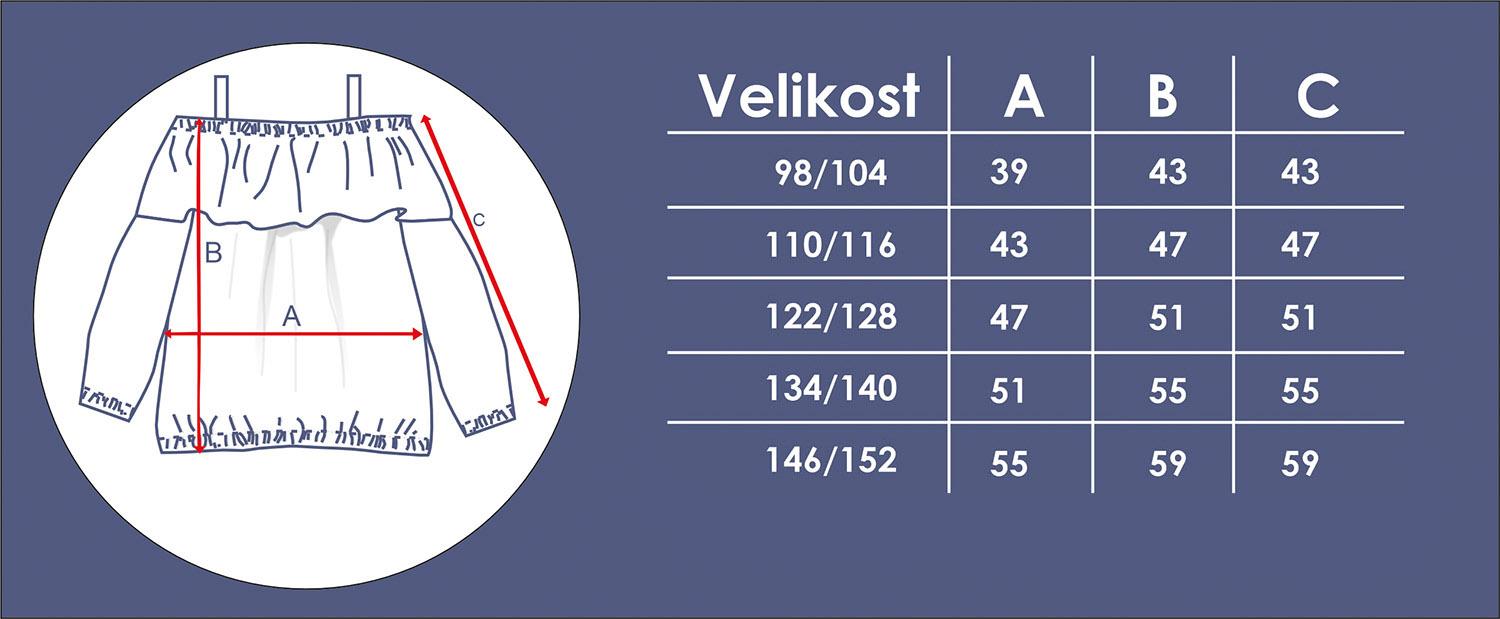 Rozměry jsou podle tabulky rozměrů, která je níže. Detska halenka s bardot výstřihem Viki Set vzor obsahuje šev.