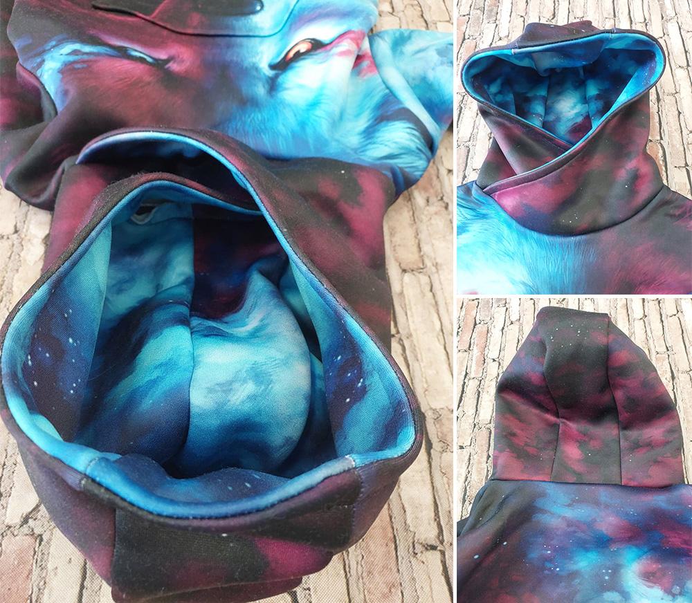 - 6 elementów kaptura (3x warstwa zewnętrzna, 3x warstwa wewnętrzna),